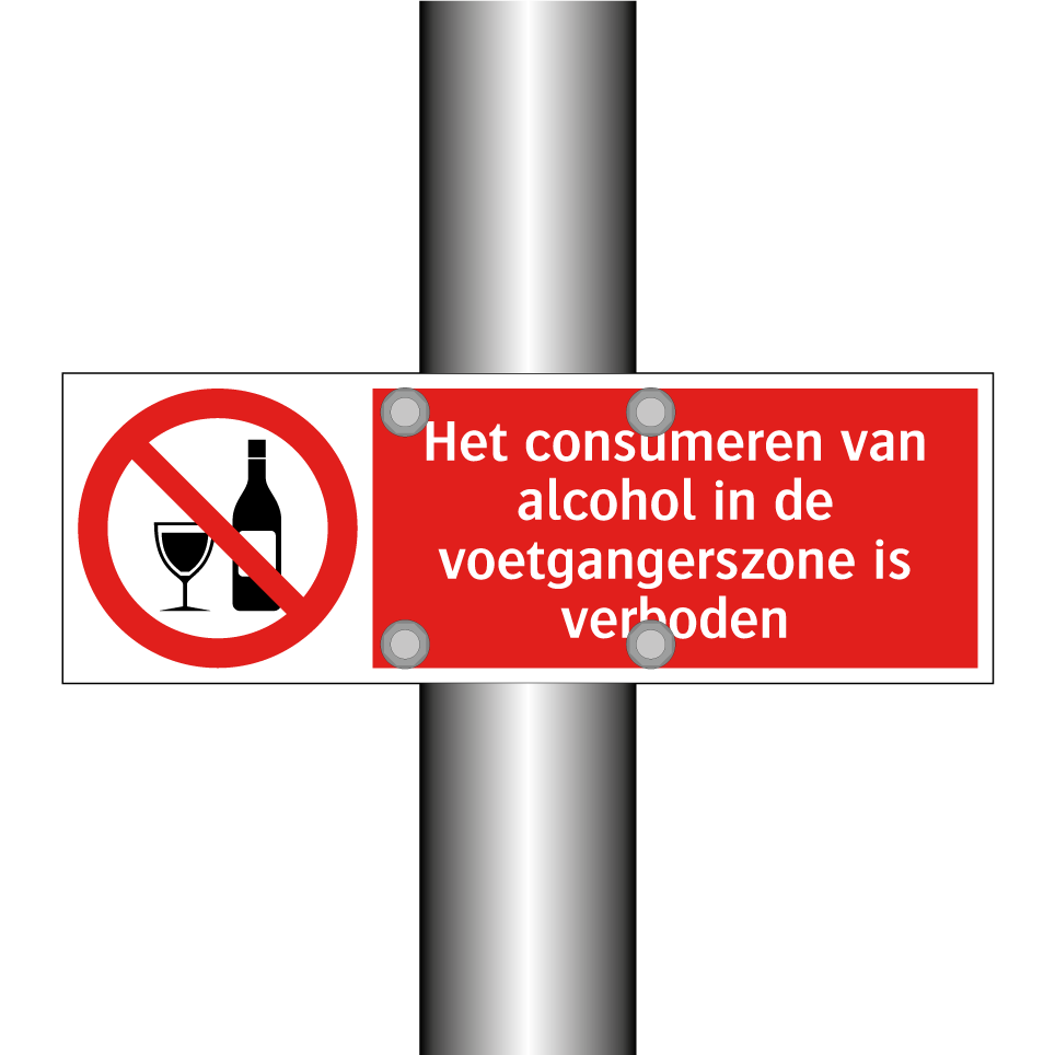 Verbodsbord met de tekst Het consumeren van alcohol in de voetgangerszone is verboden