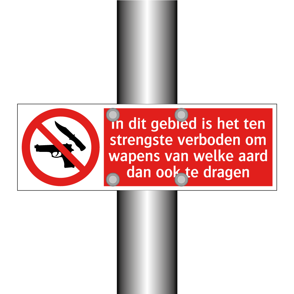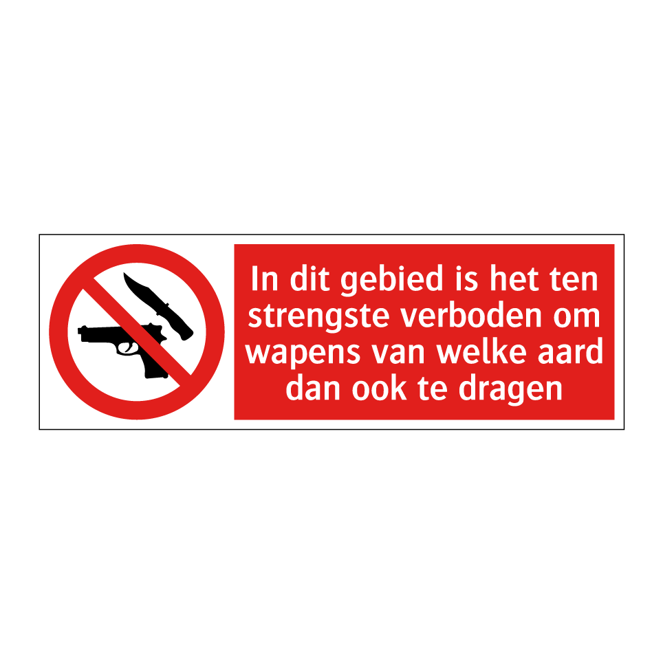 Verbodsbord met de tekst In dit gebied is het ten strengste verboden om wapens van welke aard dan ook te dragen