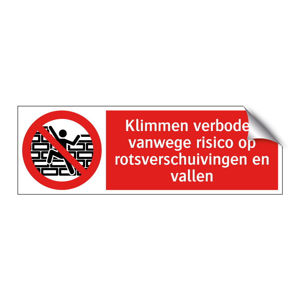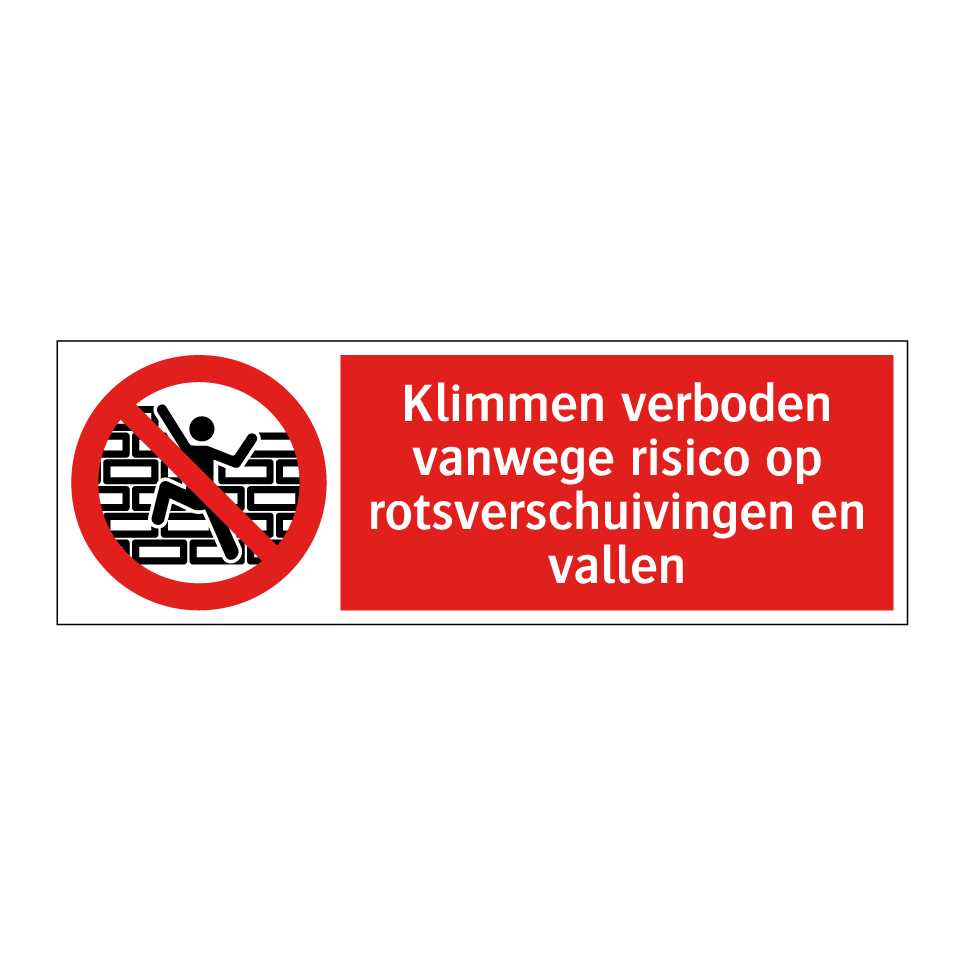 Verbodsbord met de tekst Klimmen verboden vanwege risico op rotsverschuivingen en vallen