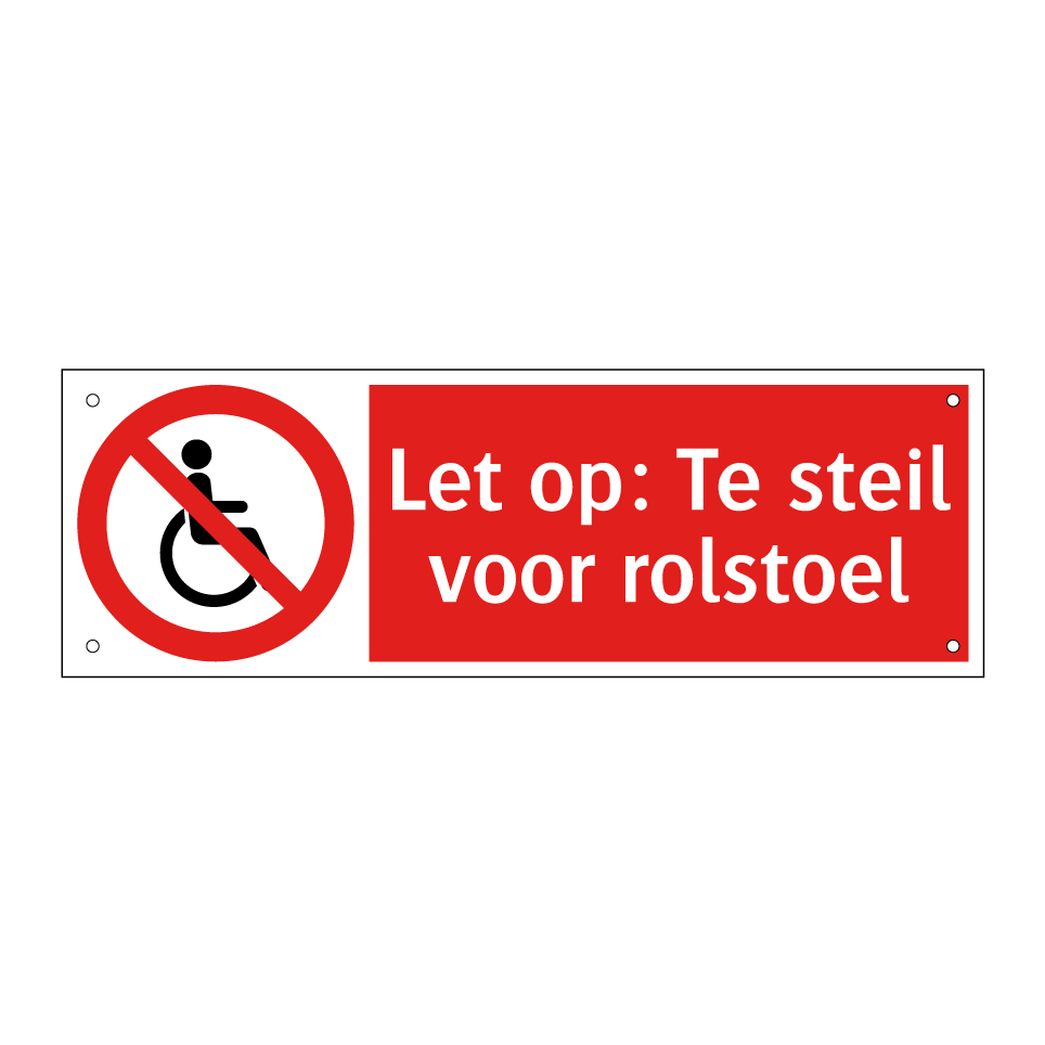 Verbodsbord met de tekst Let op: Te steil voor rolstoel