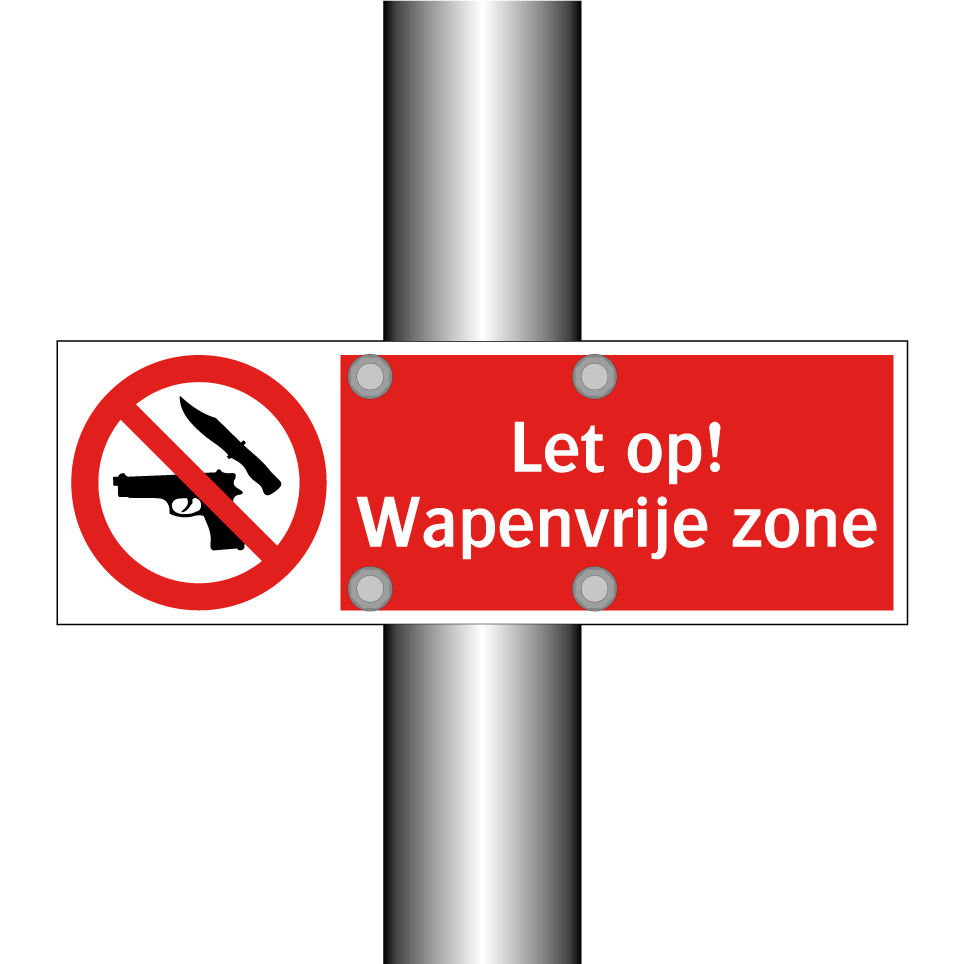 Verbodsbord met de tekst Let op! Wapenvrije zone