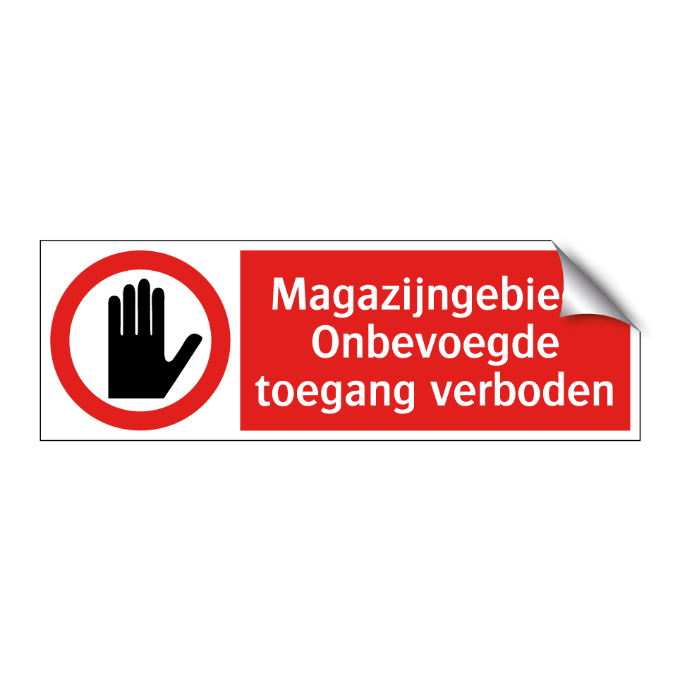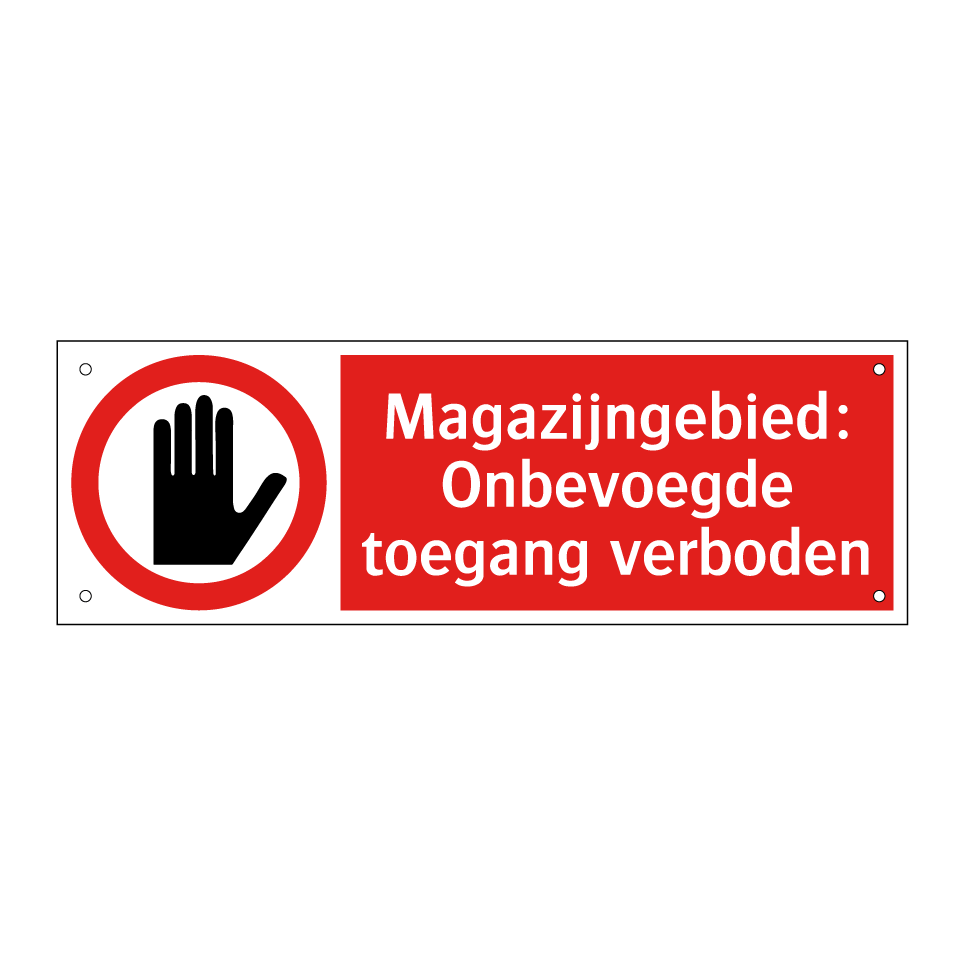 Verbodsbord met de tekst Magazijngebied: Onbevoegde toegang verboden