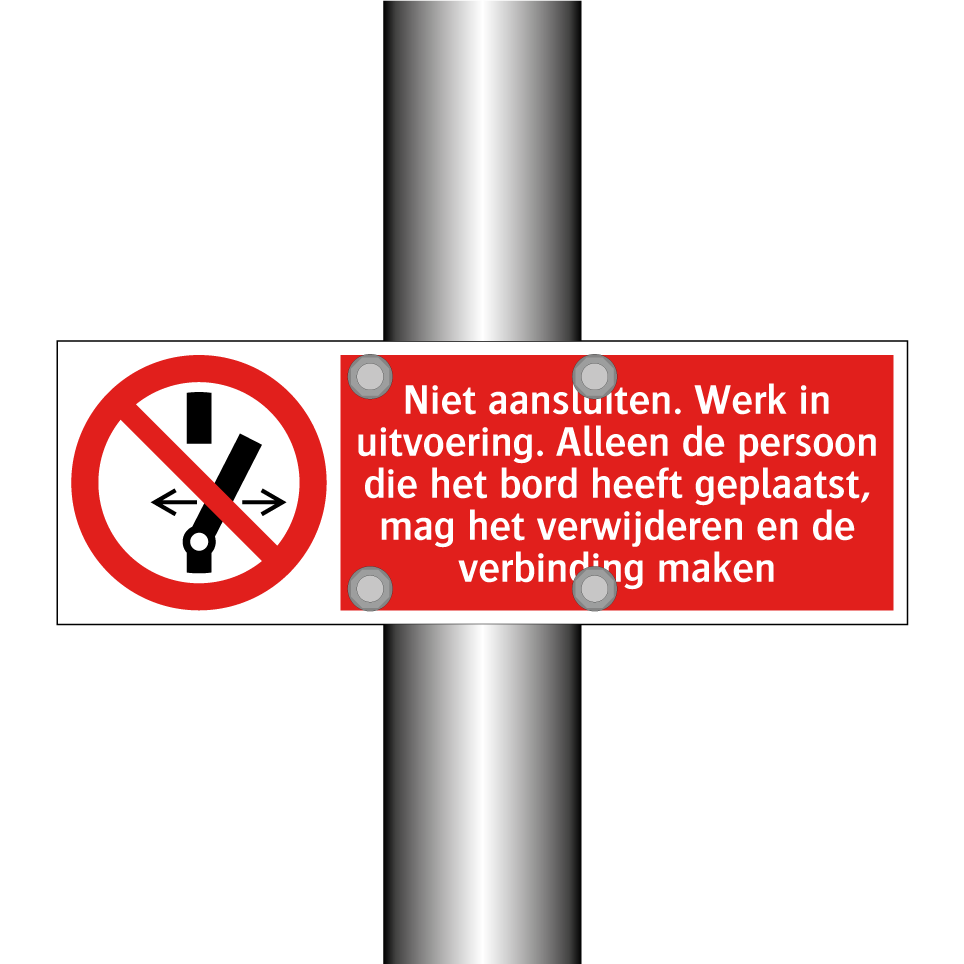 Verbodsbord met de tekst Niet aansluiten. Werk in uitvoering. Alleen de persoon die het bord heeft geplaatst, mag het verwijderen en de verbinding maken