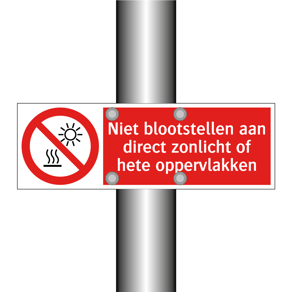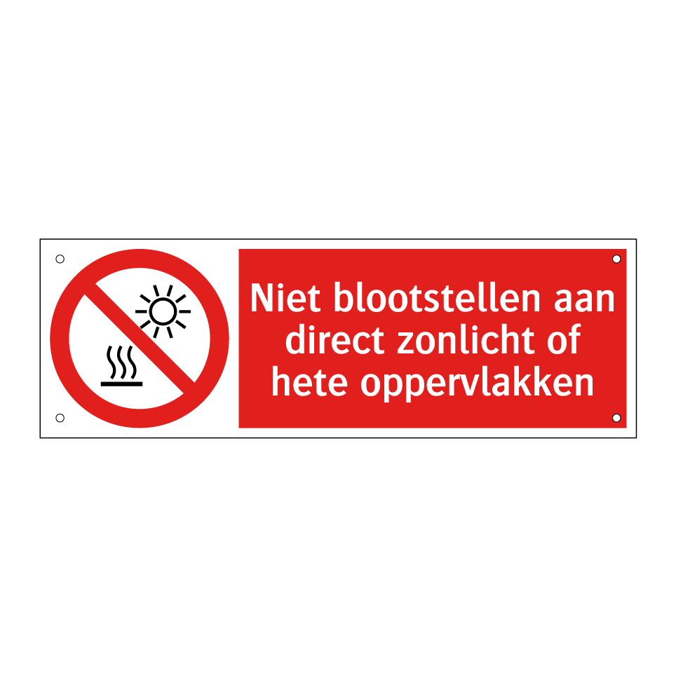 Verbodsbord met de tekst Niet blootstellen aan direct zonlicht of hete oppervlakken