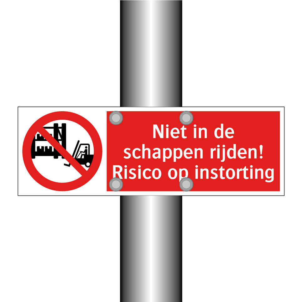 Verbodsbord met de tekst Niet in de schappen rijden! Risico op instorting