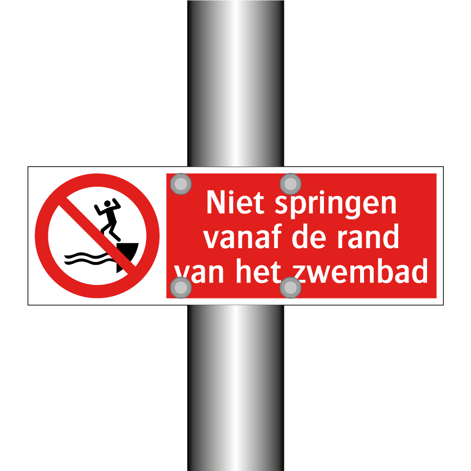Verbodsbord met de tekst Niet springen vanaf de rand van het zwembad