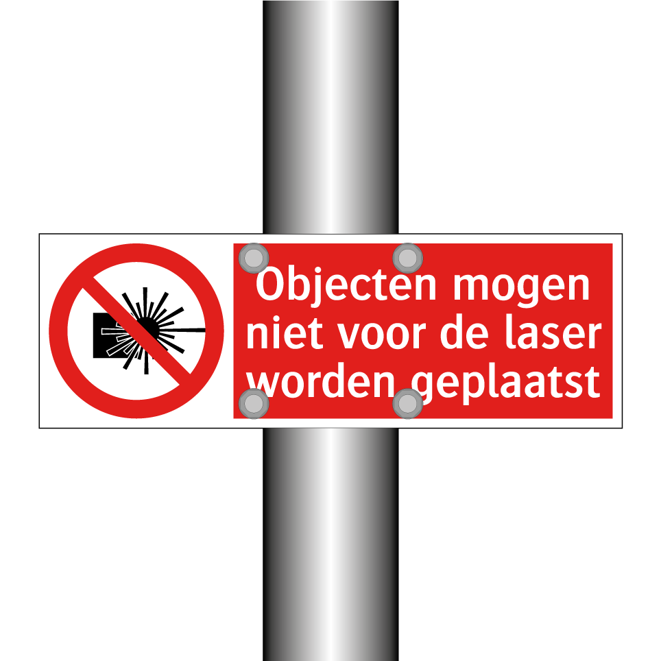 Verbodsbord met de tekst Objecten mogen niet voor de laser worden geplaatst
