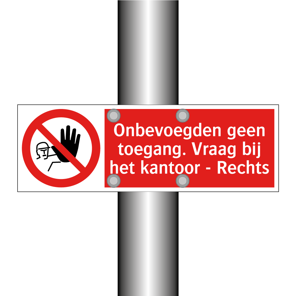 Verbodsbord met de tekst Onbevoegden geen toegang. Vraag bij het kantoor - Rechts