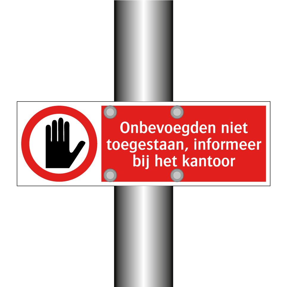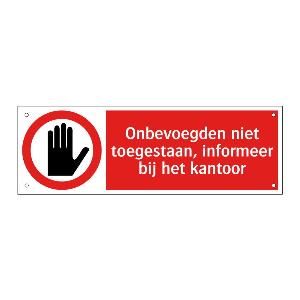 Verbodsbord met de tekst Onbevoegden niet toegestaan, informeer bij het kantoor