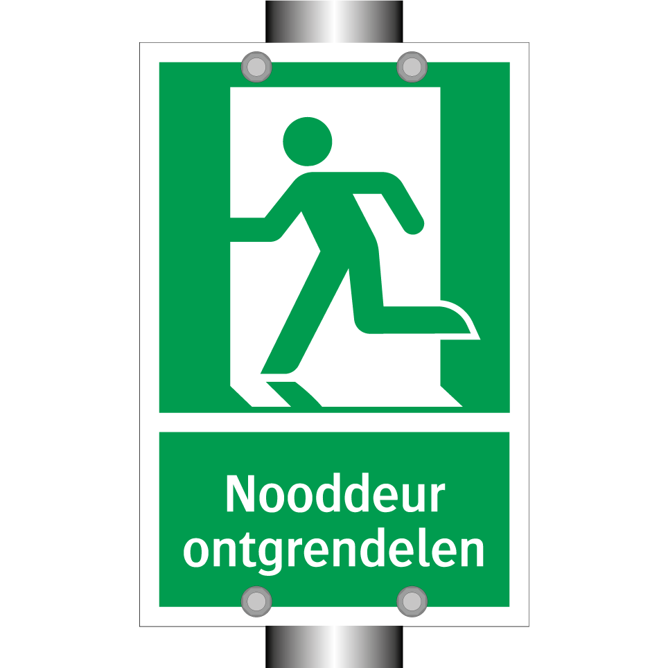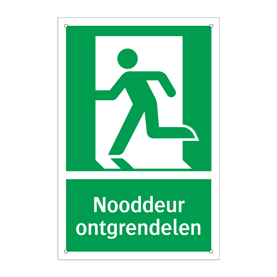 Deze noodbord is essentieel voor elke werkplek of openbare ruimte waar veiligheid prioriteit is. Het bord geeft duidelijk aan waar de nooddeur zich bevindt en hoe deze te ontgrendelen in geval van een noodsituatie. Plaats dit noodbord bij uitgangen, gangen, trappenhuizen of andere strategische locaties om ervoor te zorgen dat iedereen snel en veilig kan evacueren. De groene achtergrond met witte tekst en een duidelijke symbool zorgt voor maximale zichtbaarheid, zelfs in stressvolle situaties. Dit bordje is een onmisbaar onderdeel van uw veiligheidsuitrusting en helpt bij het waarborgen van een veilige omgeving voor iedereen.