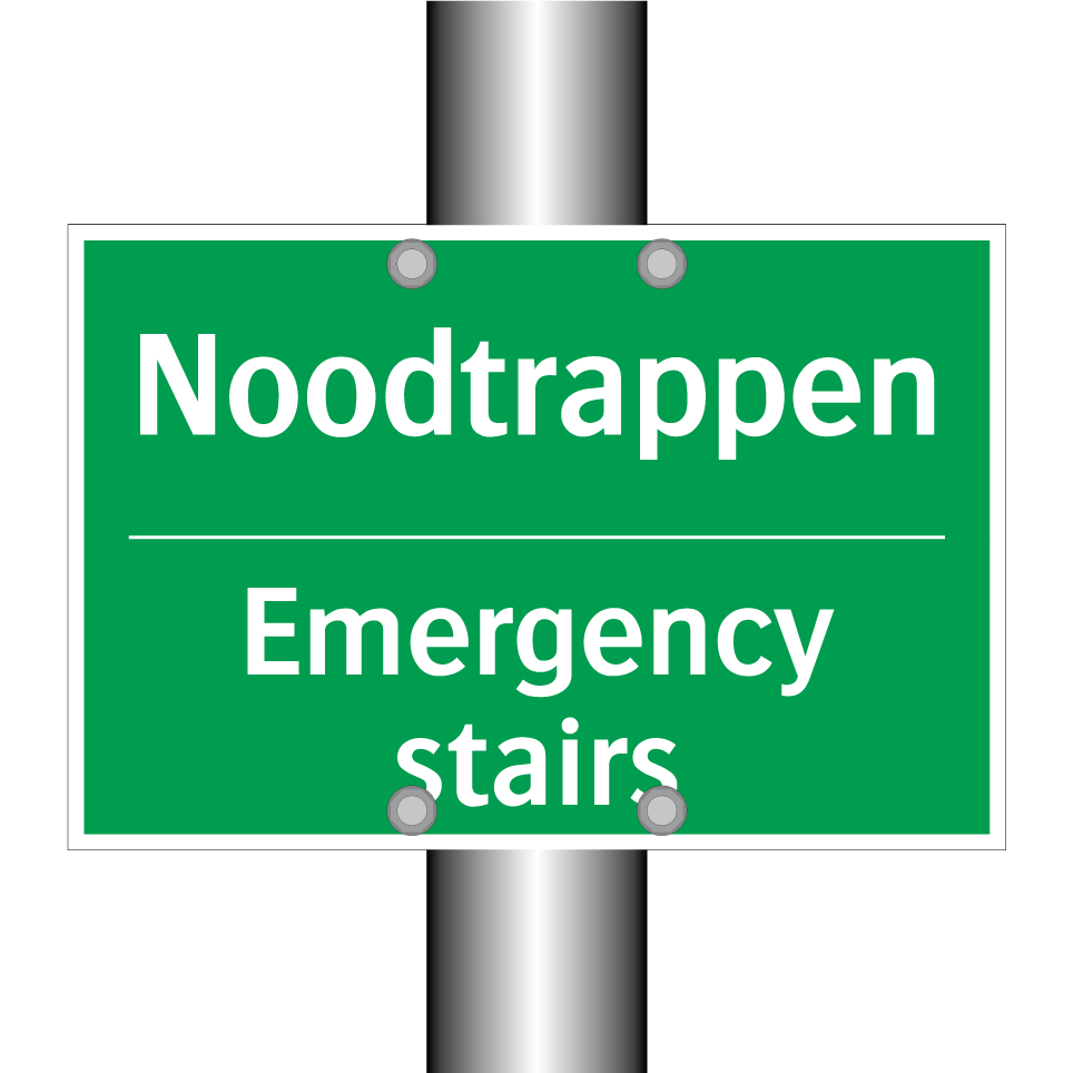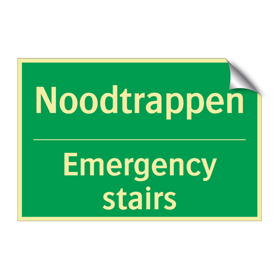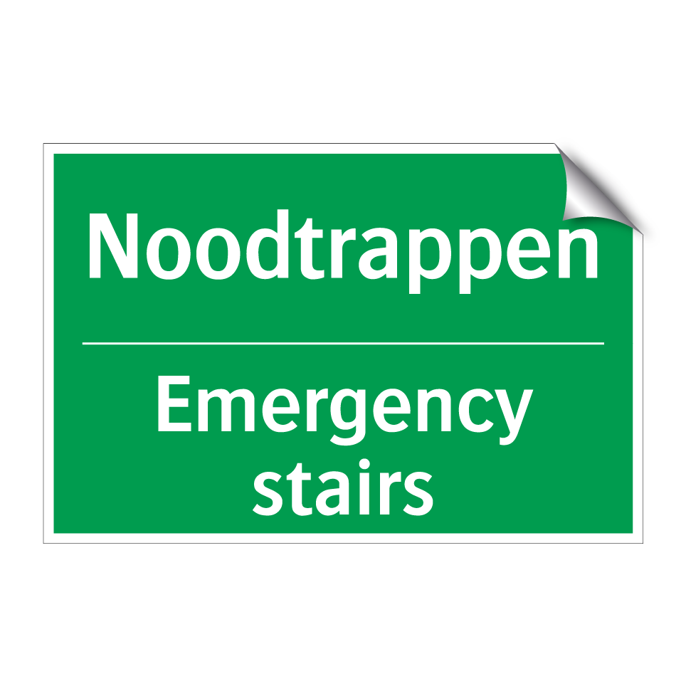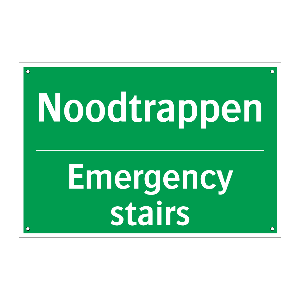 Dit noodbord is essentieel voor de veiligheid in noodsituaties. De groene achtergrond met witte tekst zorgt voor een duidelijke zichtbaarheid, zelfs van een afstand. Deze tweetalige noodbord, met tekst in zowel Nederlands als Engels, is ideaal voor internationale omgevingen zoals kantoren, hotels, en openbare gebouwen. Het bord wijst de weg naar de noodtrappen, wat cruciaal is tijdens een evacuatie. Plaats dit noodbord bij trappenhuizen, gangen en andere strategische locaties om ervoor te zorgen dat iedereen snel en veilig de nooduitgang kan vinden. De tweetalige tekst verhoogt de toegankelijkheid en zorgt ervoor dat zowel Nederlandstalige als Engelstalige personen de instructies begrijpen.