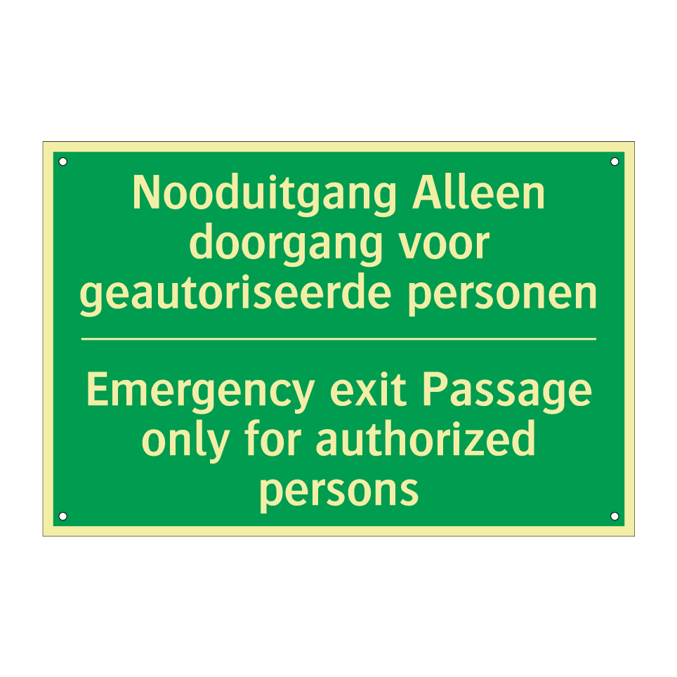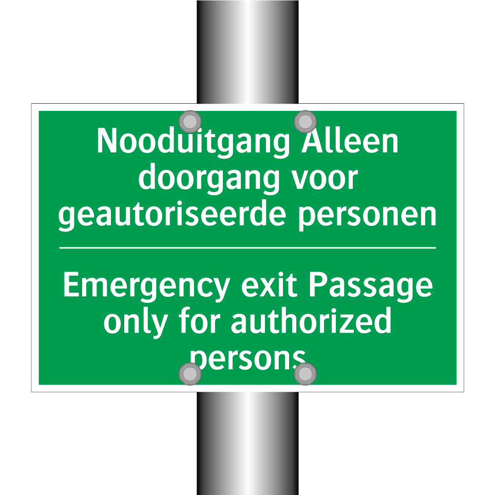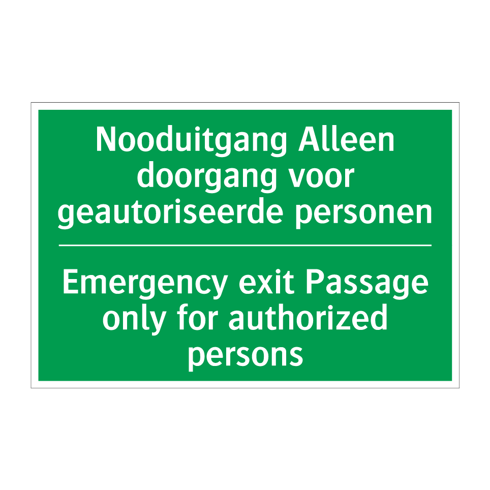 Noodbord met tekst Nooduitgang Alleen doorgang voor geautoriseerde personen / Emergency exit Passage only for authorized persons