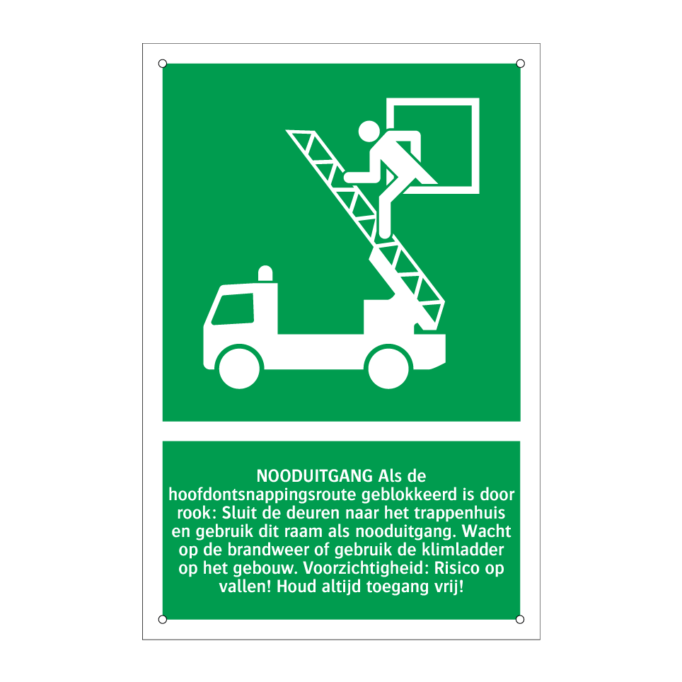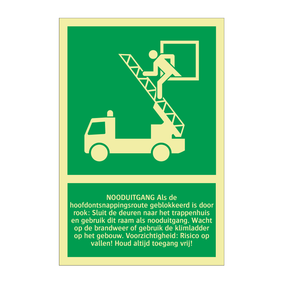 Noodbord met tekst NOODUITGANG Als de hoofdontsnappingsroute geblokkeerd is door rook: Sluit de deuren naar het trappenhuis en gebruik dit raam als nooduitgang. Wacht op de brandweer of gebruik de klimladder op het gebouw. Voorzichtigheid: Risico op vallen! Houd altijd toegang vrij!