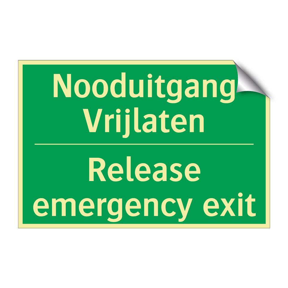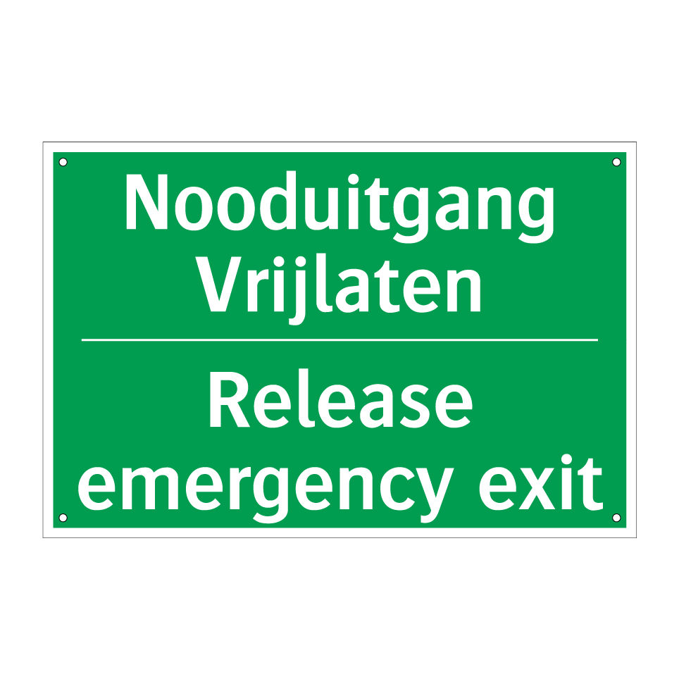 Noodbord met tekst Nooduitgang Vrijlaten / Release emergency exit.