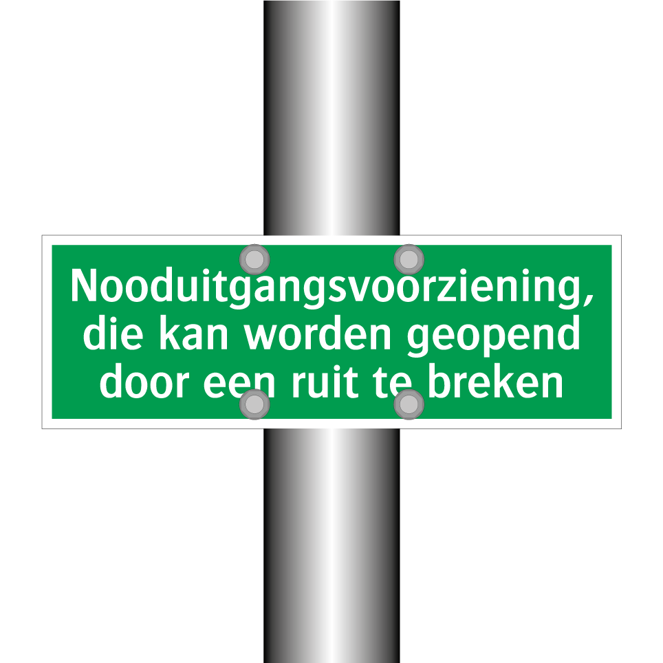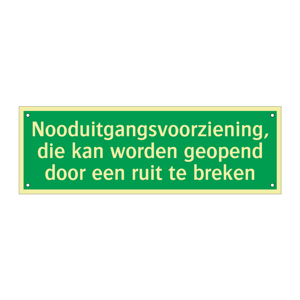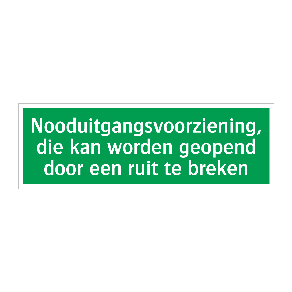 Noodbord met tekst Nooduitgangsvoorziening, die kan worden geopend door een ruit te breken