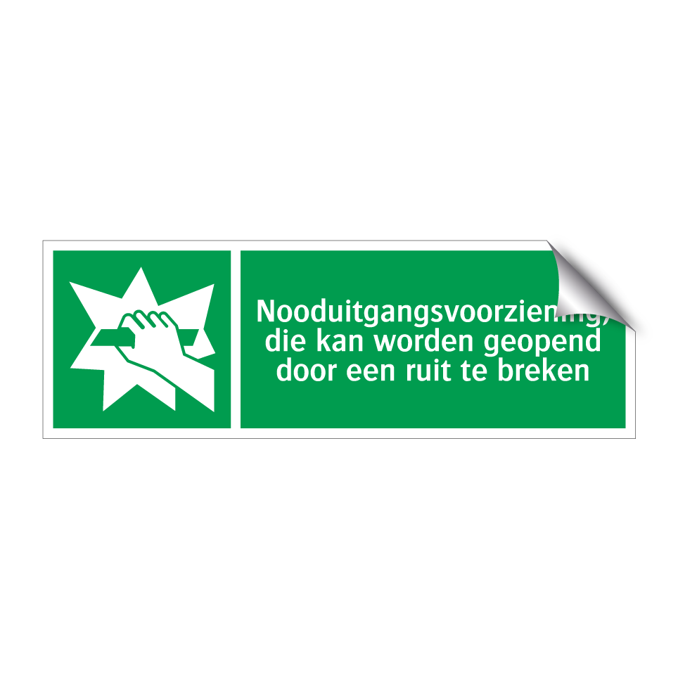 Noodbord met tekst Nooduitgangsvoorziening, die kan worden geopend door een ruit te breken