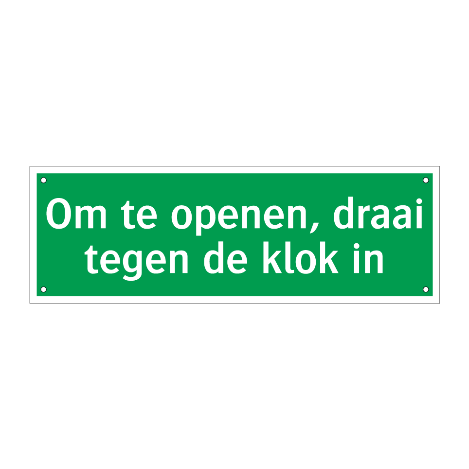 Deze noodbord is essentieel voor elke omgeving waar veiligheid voorop staat. Het bord geeft duidelijk aan hoe een nooduitgang of noodvoorziening geopend moet worden, namelijk door tegen de klok in te draaien. Dit maakt het ideaal voor gebruik in kantoren, fabrieken, scholen en andere openbare gebouwen. Plaats het bord op goed zichtbare plekken zoals bij nooduitgangen, naast brandblussers of bij andere veiligheidsvoorzieningen. Door de opvallende groene kleur met witte tekst is het bord snel te herkennen en eenvoudig te begrijpen, zelfs in stressvolle situaties. Zorg voor een veilige omgeving door dit noodbord strategisch te plaatsen.