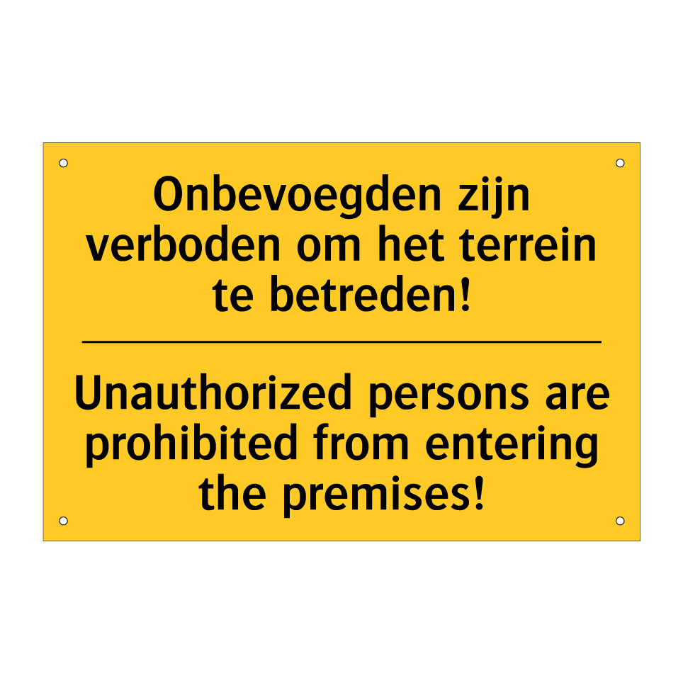 Waarschuwingsbord met de tekst Onbevoegden zijn verboden om het terrein te betreden! / Unauthorized persons are prohibited from entering the premises!