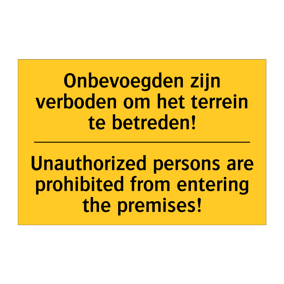 Dit waarschuwingsbord is ideaal voor het beveiligen van uw terrein en het voorkomen van ongeautoriseerde toegang. Met een opvallende gele achtergrond en duidelijke zwarte tekst, zorgt Dit bordje ervoor dat onbevoegden direct worden gewaarschuwd. De tweetalige tekst, in zowel Nederlands als Engels, maakt het bord geschikt voor internationale locaties en zorgt voor een bredere begrijpelijkheid. Plaats dit waarschuwingsbord bij ingangen, hekken, poorten of andere toegangswegen om de veiligheid te waarborgen en ongewenste bezoekers af te schrikken. Perfect voor bouwplaatsen, bedrijfsterreinen, magazijnen en andere beveiligde gebieden.