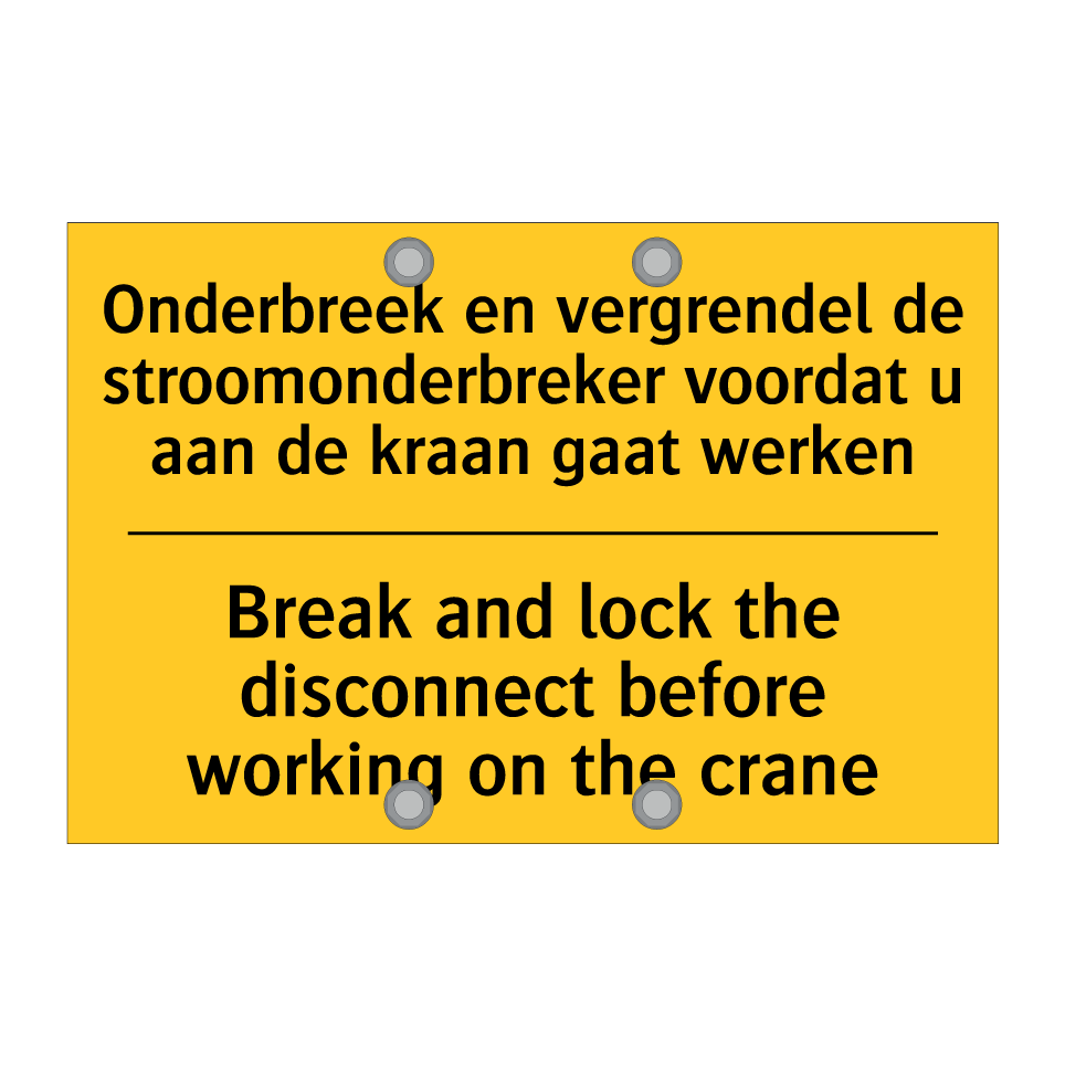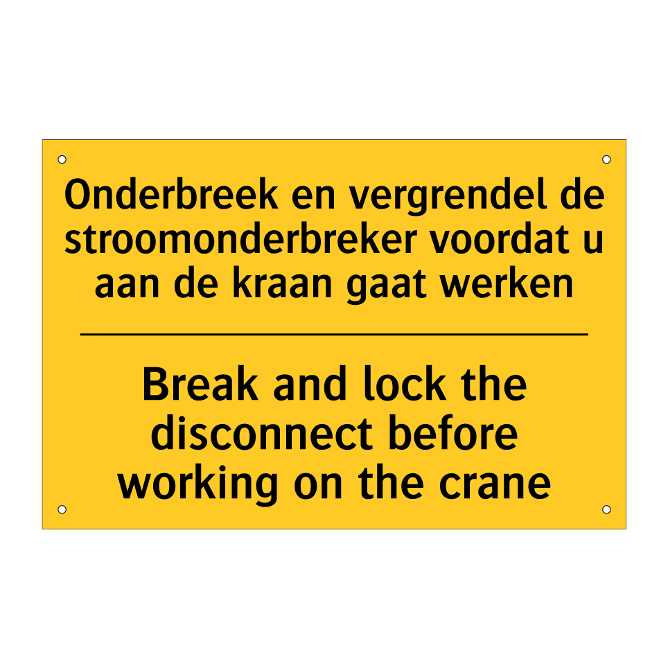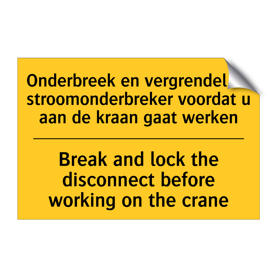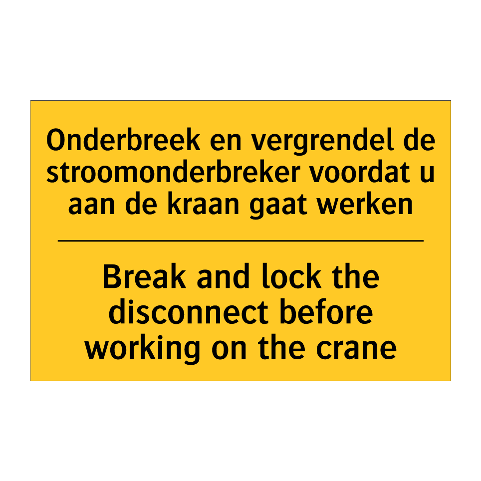 Waarschuwingsbord met de tekst Onderbreek en vergrendel de stroomonderbreker voordat u aan de kraan gaat werken / Break and lock the disconnect before working on the crane