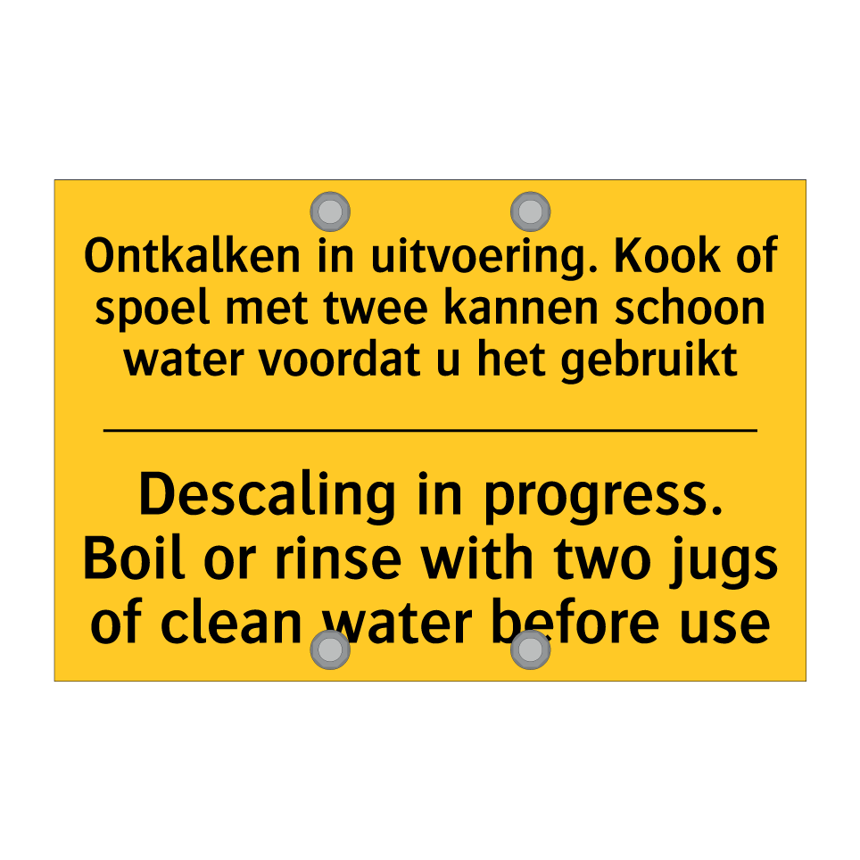 Waarschuwingsbord met de tekst Ontkalken in uitvoering. Kook of spoel met twee kannen schoon water voordat u het gebruikt / Descaling in progress. Boil or rinse with two jugs of clean water before use