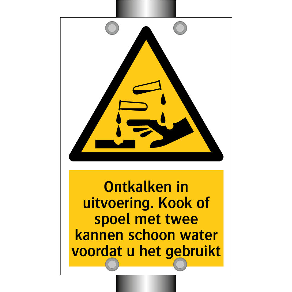 Waarschuwingsbord met de tekst Ontkalken in uitvoering. Kook of spoel met twee kannen schoon water voordat u het gebruikt