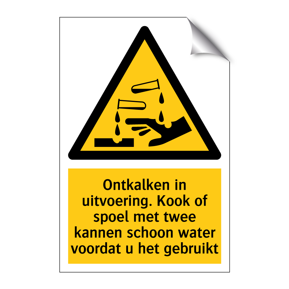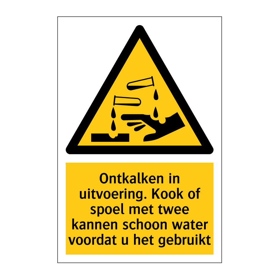 Deze waarschuwingsbord is essentieel voor het waarborgen van de veiligheid tijdens ontkalkingswerkzaamheden. Plaats deze bord op zichtbare locaties zoals keukens, badkamers of andere ruimtes waar water wordt gebruikt om gebruikers te informeren over de noodzaak om twee kannen schoon water te gebruiken voordat ze het water koken of spoelen. Dit waarschuwingsbord helpt ongelukken te voorkomen en zorgt ervoor dat iedereen op de hoogte is van de lopende ontkalkingsprocedures. Ideaal voor zowel huishoudelijke als commerciële omgevingen, biedt deze bord duidelijke instructies en verhoogt het bewustzijn van de veiligheid.