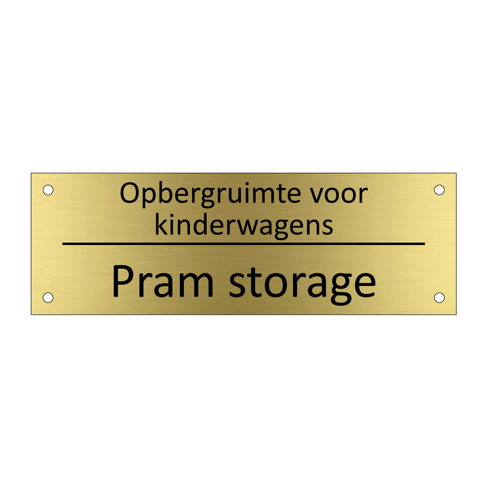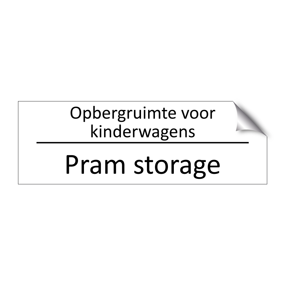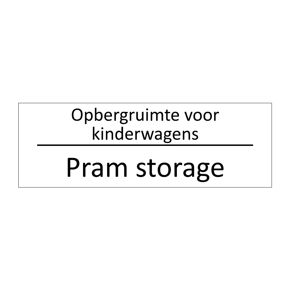Informatiebord met tekst in het nederlands en engels. Dit bord luidt: Opbergruimte voor kinderwagens evenals met de engelse vertaling Pram storage.
