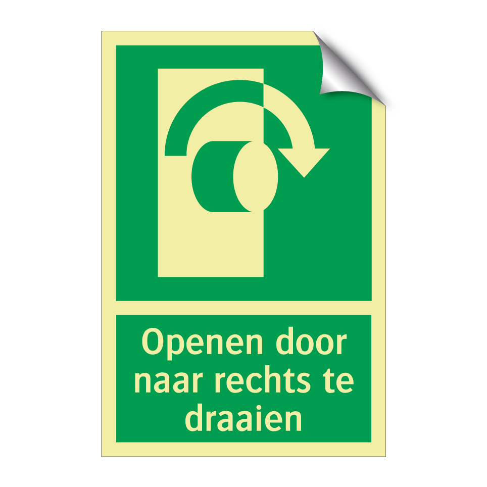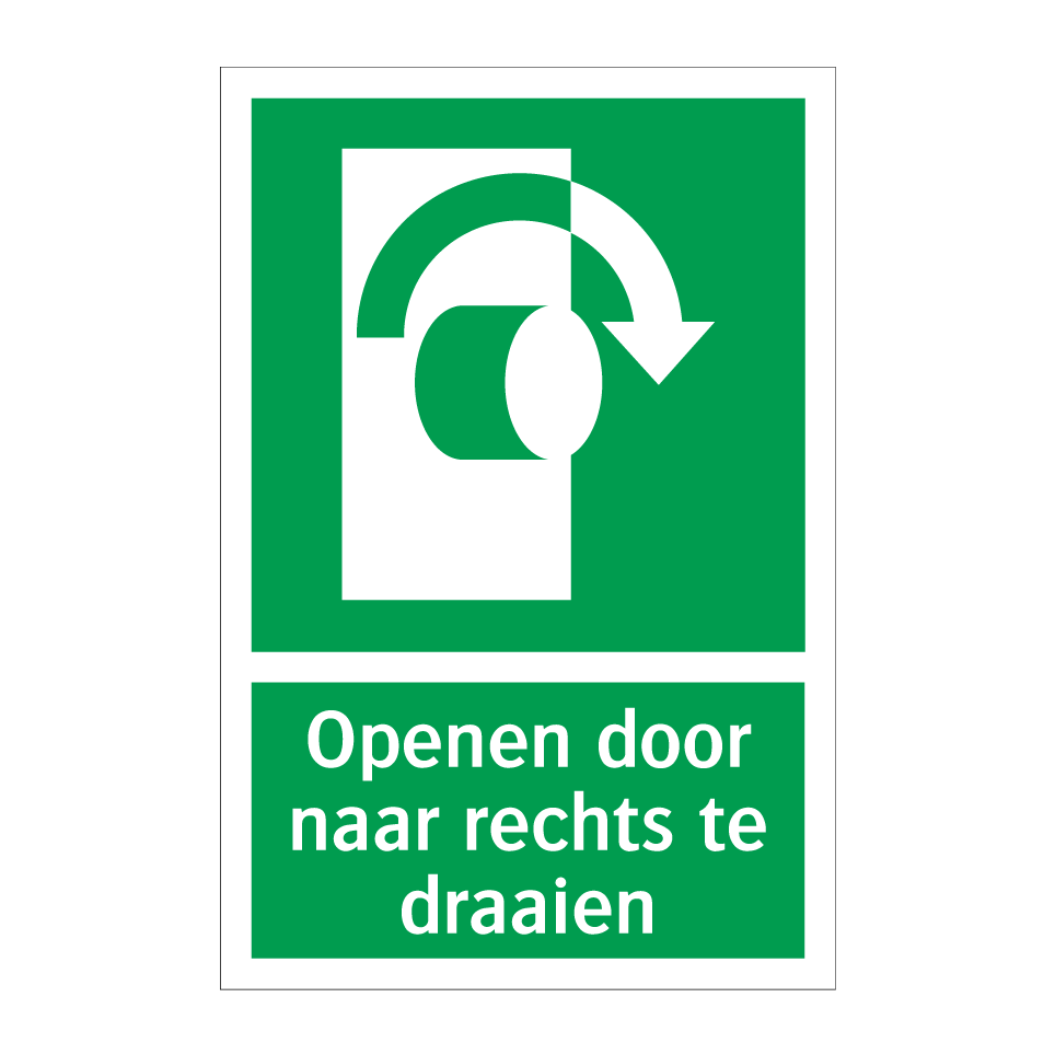 Deze noodbord is essentieel voor elke werkplek of openbare ruimte waar veiligheid voorop staat. Het bord geeft duidelijk aan dat de deur naar rechts moet worden gedraaid om te openen, wat cruciaal kan zijn in noodsituaties. Plaats deze noodbord bij nooduitgangen, trappenhuizen, of andere strategische locaties waar snelle evacuatie noodzakelijk is. Door de opvallende groene kleur en witte tekst met symbool, is het bord gemakkelijk te herkennen en te begrijpen, zelfs in stressvolle situaties. Zorg voor een veilige omgeving door deze duidelijke en effectieve noodbord te installeren.