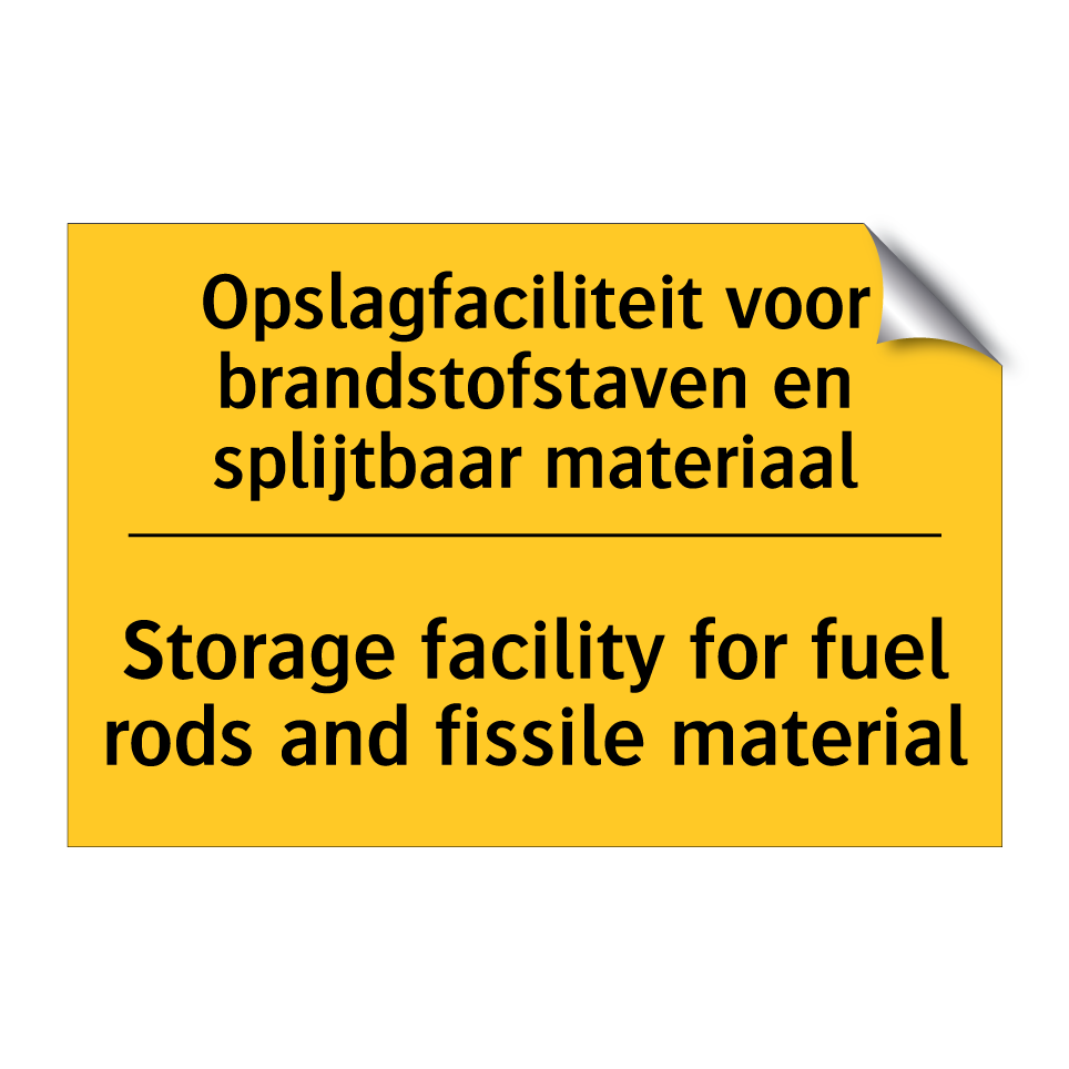 Waarschuwingsbord met de tekst Opslagfaciliteit voor brandstofstaven en splijtbaar materiaal / Storage facility for fuel rods and fissile material