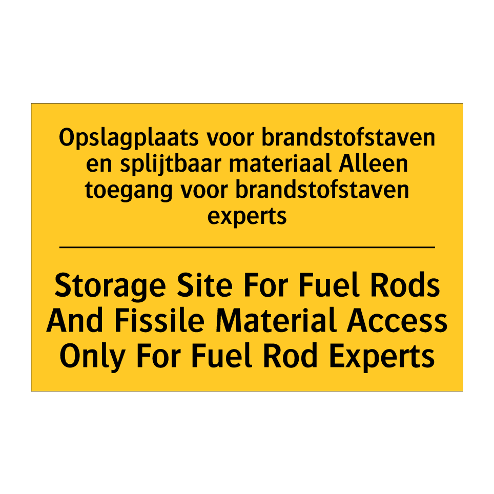 Waarschuwingsbord met de tekst Opslagplaats voor brandstofstaven en splijtbaar materiaal Alleen toegang voor brandstofstaven experts / Storage Site For Fuel Rods And Fissile Material Access Only For Fuel Rod Experts