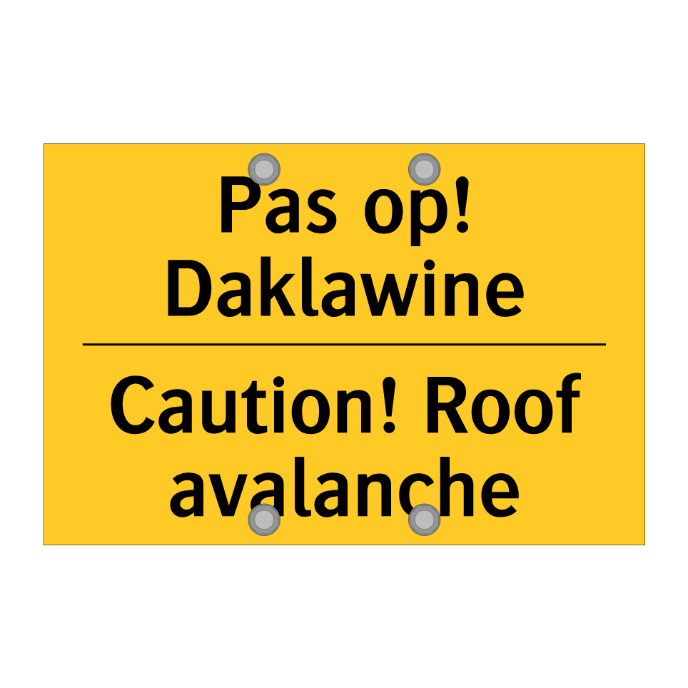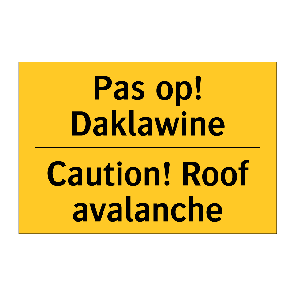 Waarschuwingsbord met de tekst Pas op! Daklawine / Caution! Roof avalanche