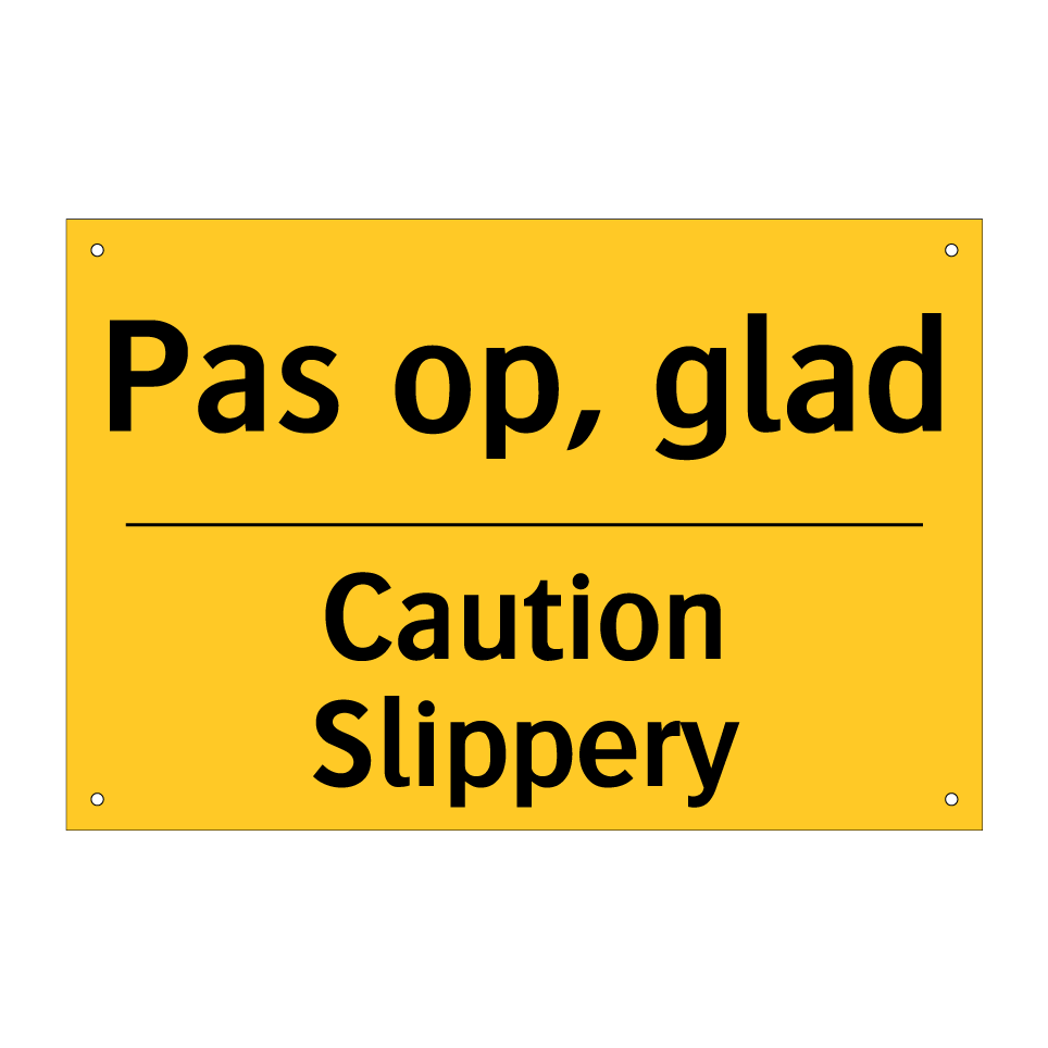 Waarschuwingsbord met de tekst Pas op, glad / Caution Slippery