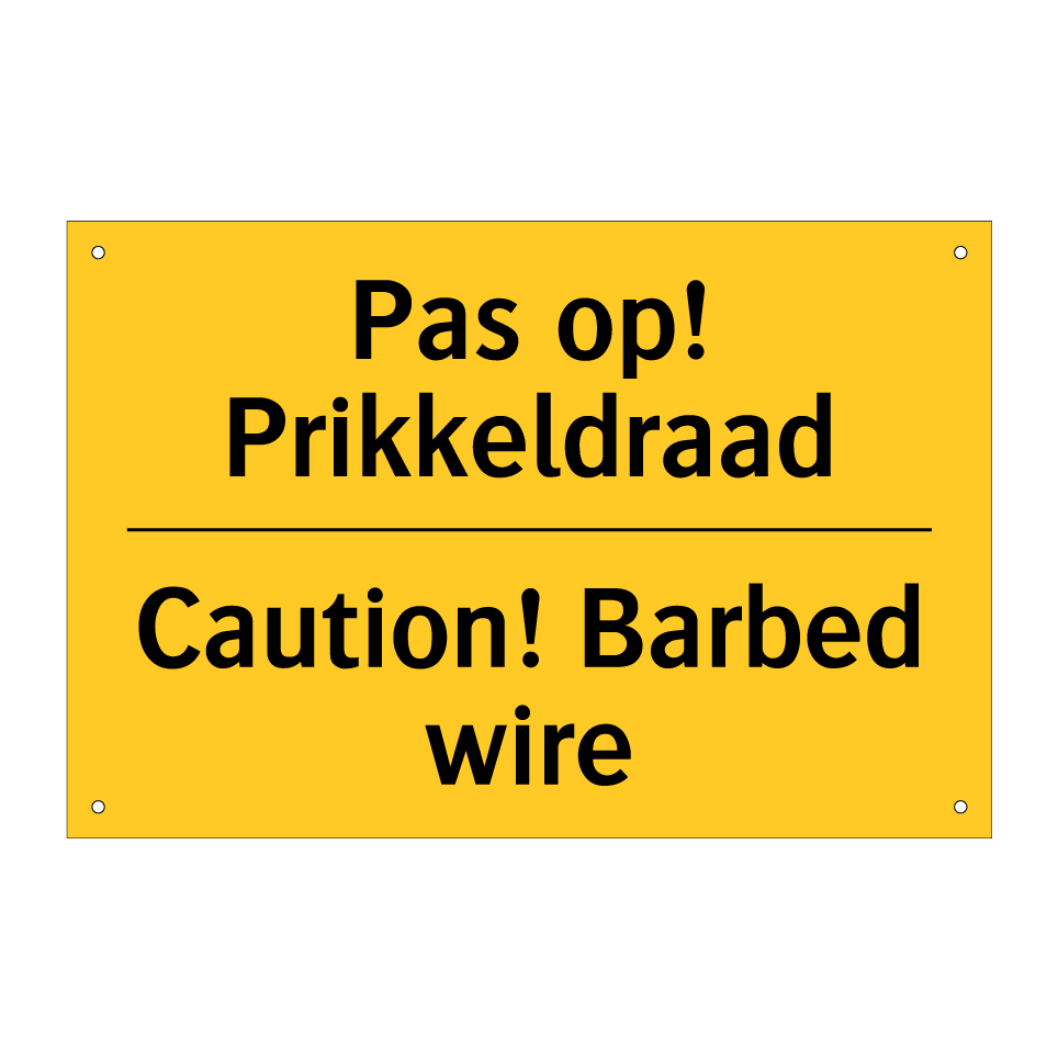 Waarschuwingsbord met de tekst Pas op! Prikkeldraad / Caution! Barbed wire