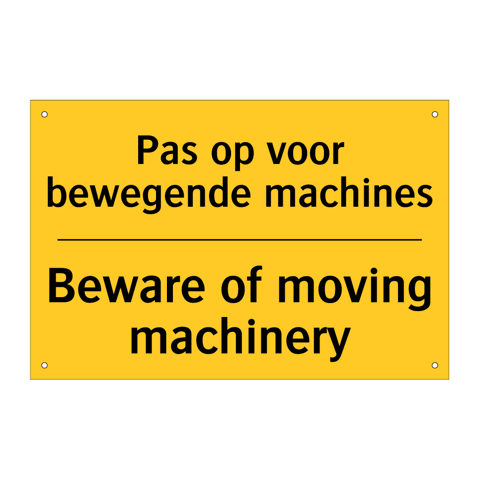 Waarschuwingsbord met de tekst Pas op voor bewegende machines / Beware of moving machinery