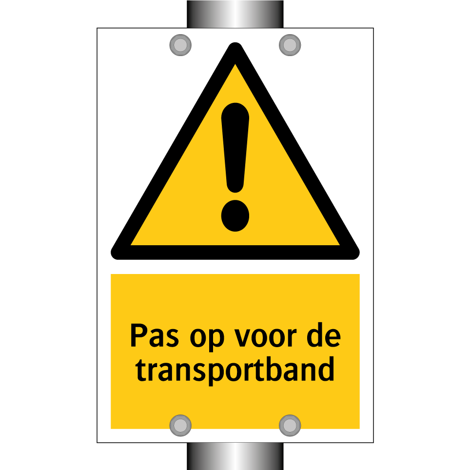 Waarschuwingsbord met de tekst Pas op voor de transportband