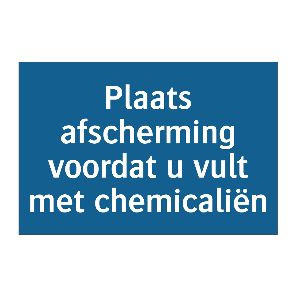 Verplichte bord met de tekst Plaats afscherming voordat u vult met chemicaliën