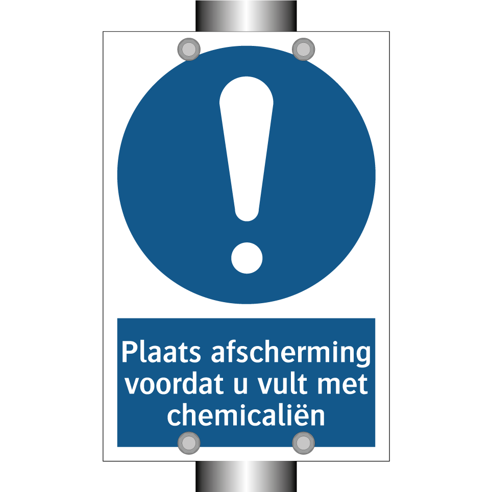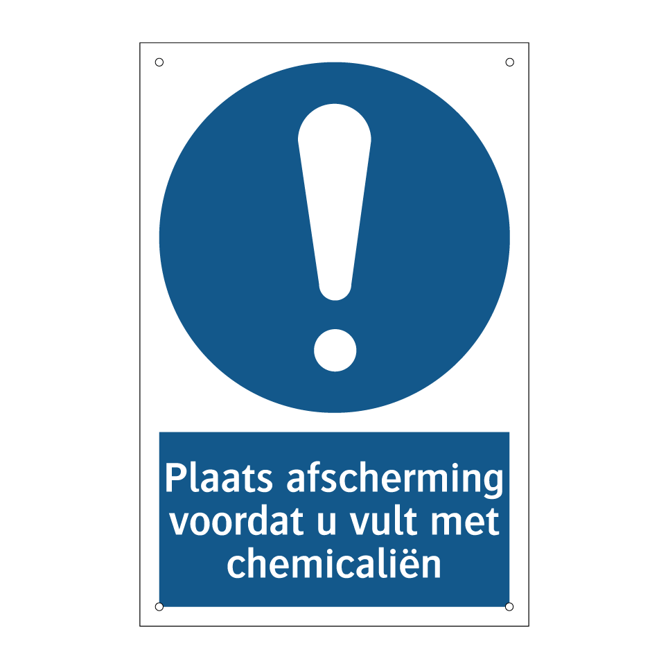 Verplichte bord met de tekst Plaats afscherming voordat u vult met chemicaliën