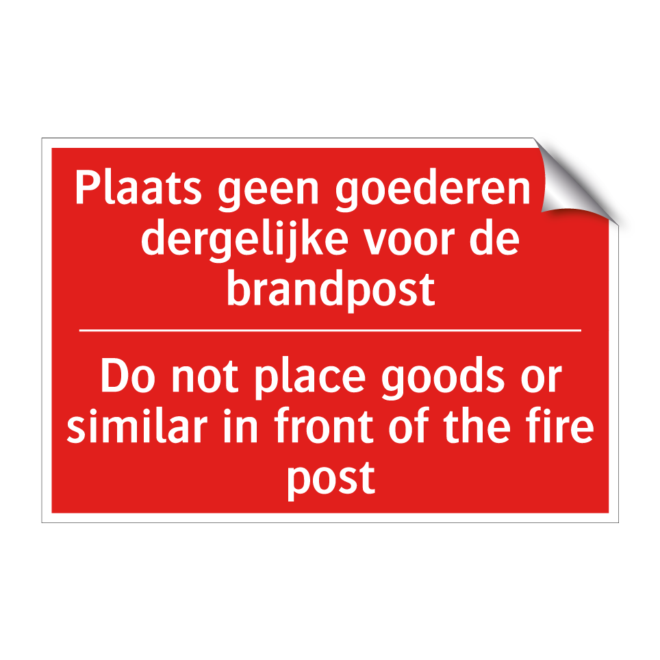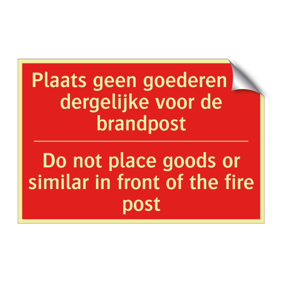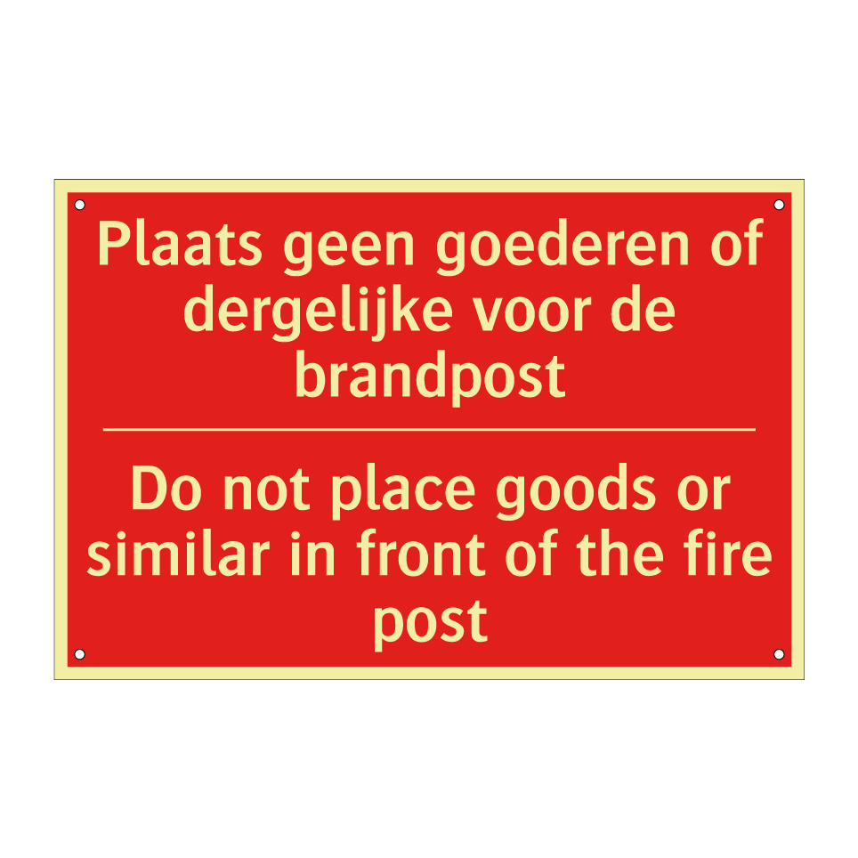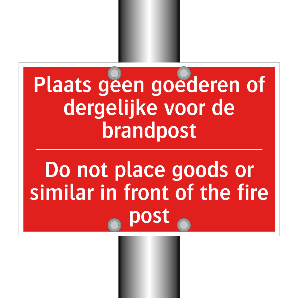 Brandbord met tekst Plaats geen goederen of dergelijke voor de brandpost - Do not place goods or similar in front of the fire post