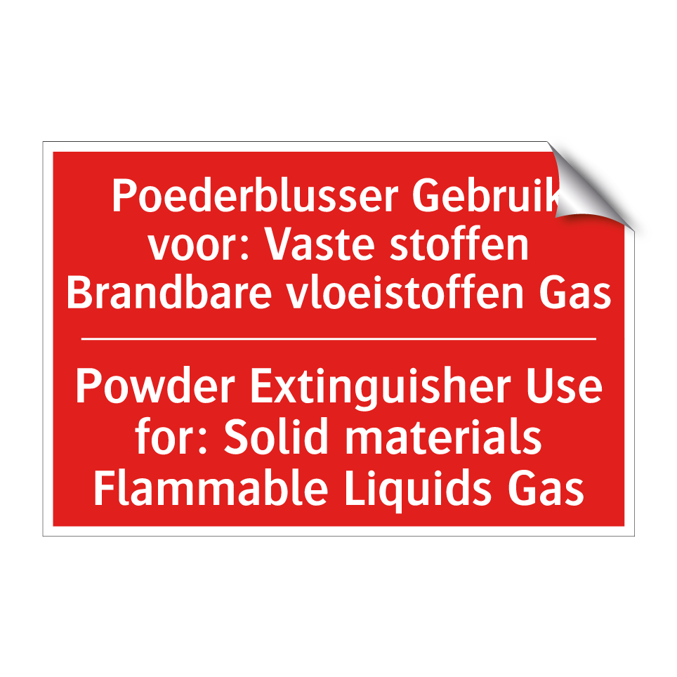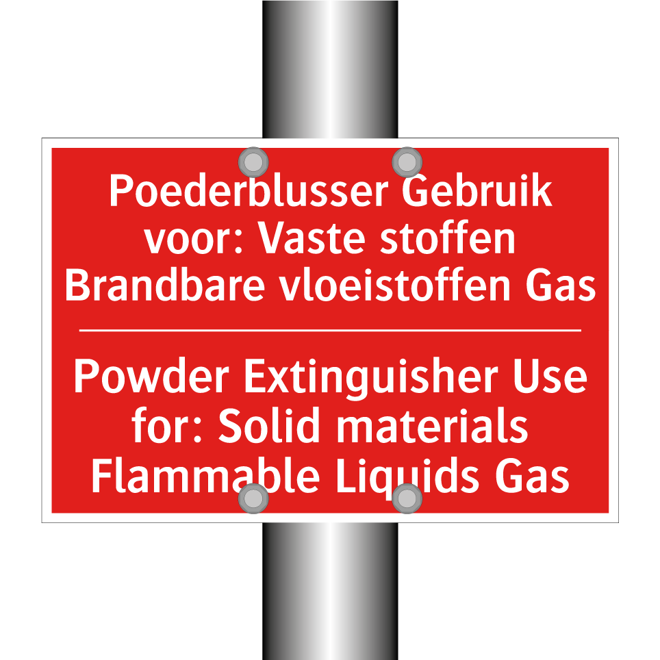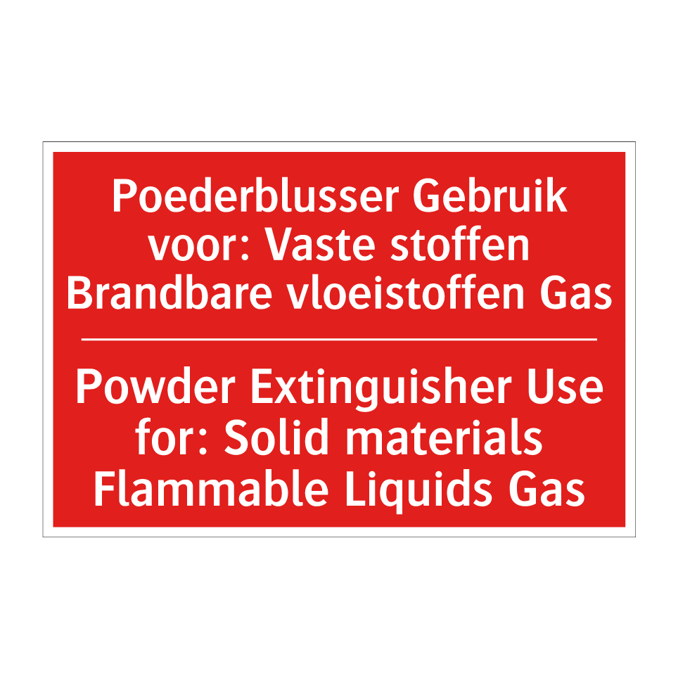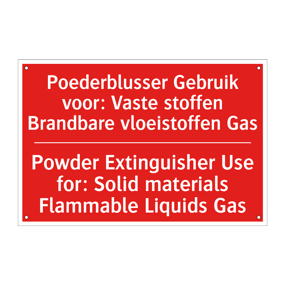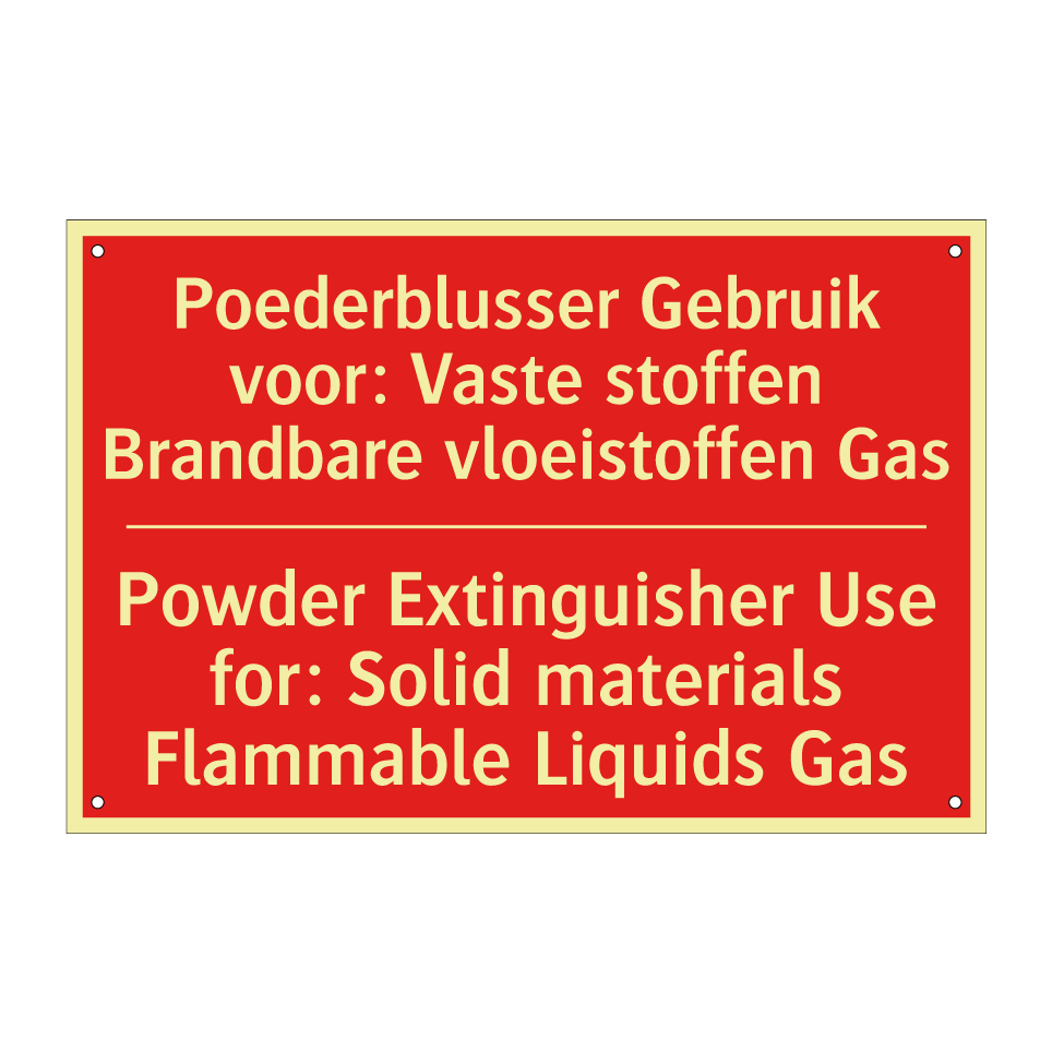Brandbord met tekst Poederblusser Gebruik voor: Vaste stoffen Brandbare vloeistoffen Gas / Powder Extinguisher Use for: Solid materials Flammable Liquids Gas