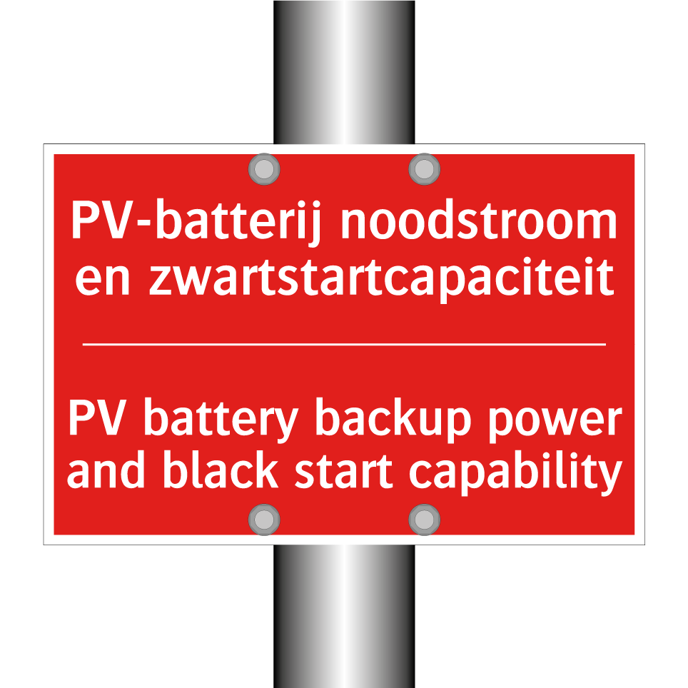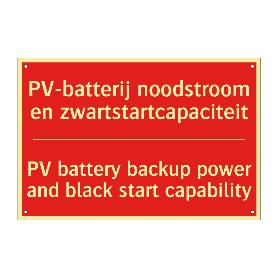 Brandbord met tekst PV-batterij noodstroom en zwartstartcapaciteit - PV battery backup power and black start capability