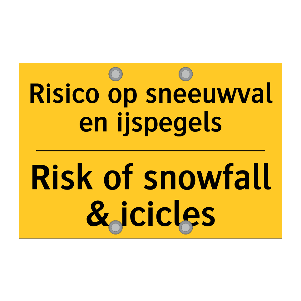 Waarschuwingsbord met de tekst Risico op sneeuwval en ijspegels / Risk of snowfall & icicles