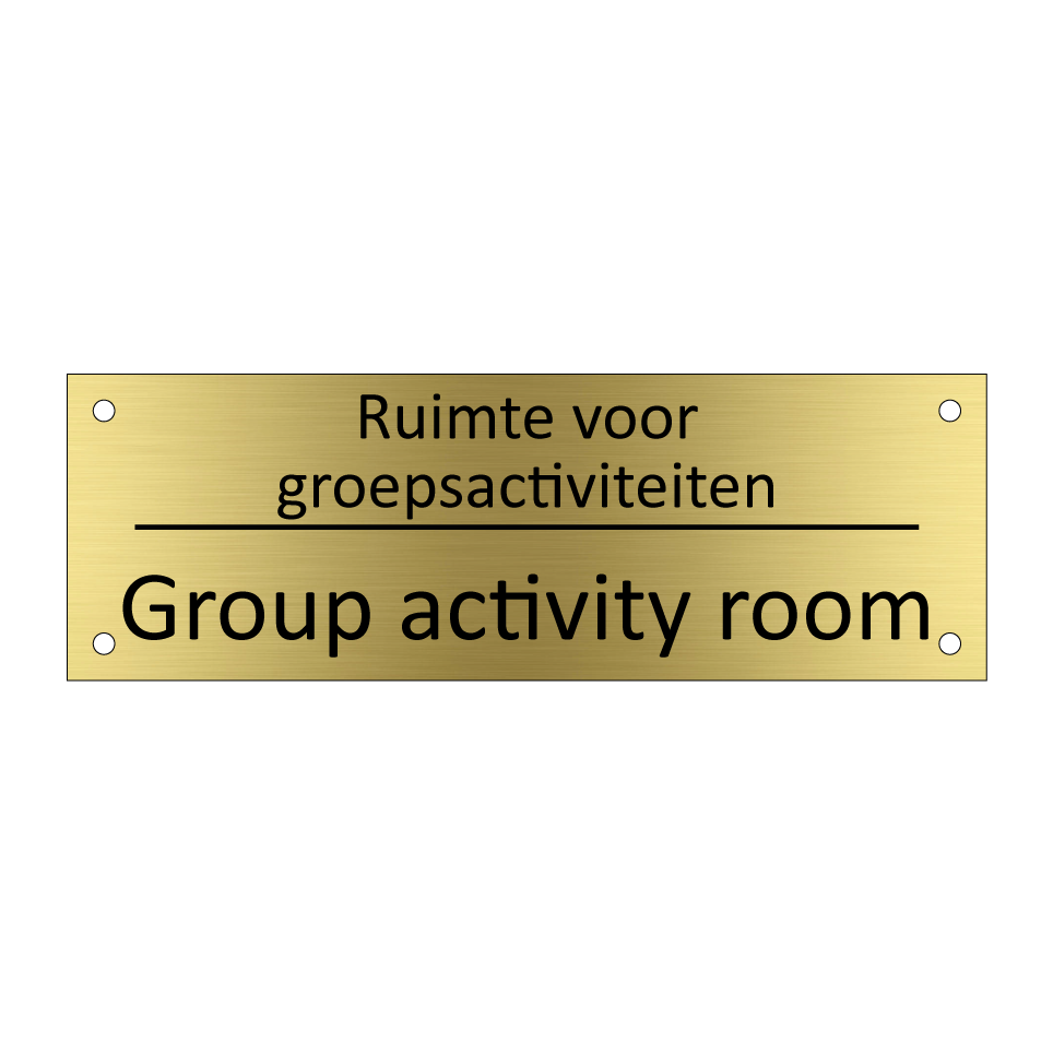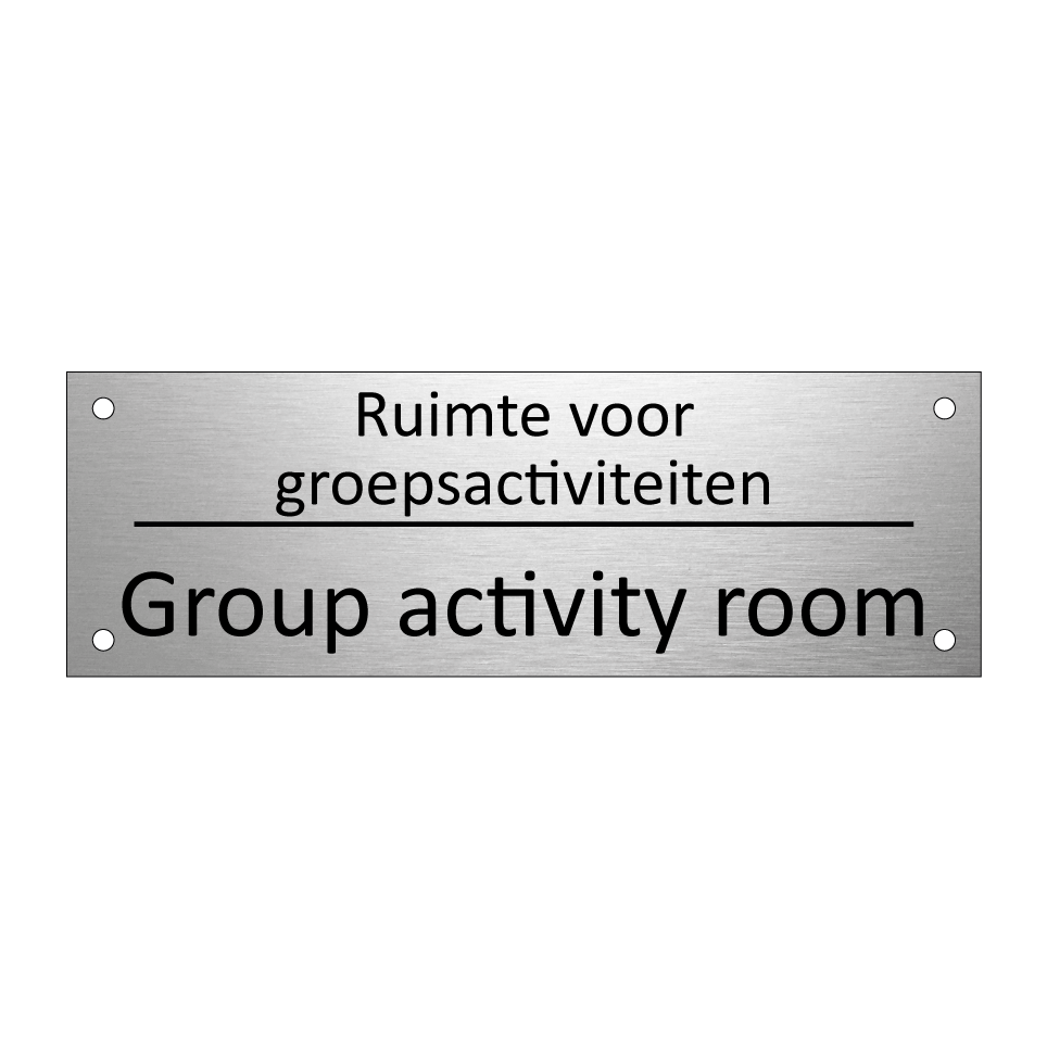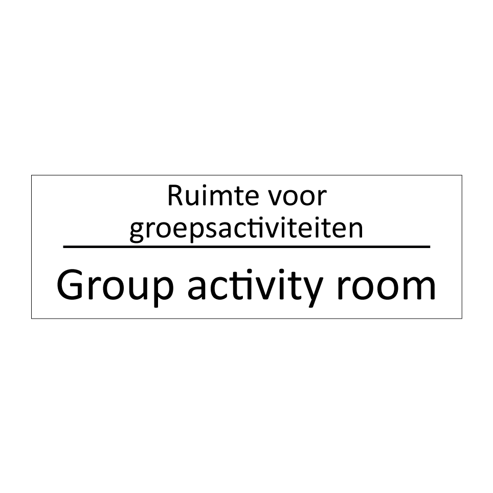Informatiebord met tekst in het nederlands en engels. Dit bord luidt: Ruimte voor groepsactiviteiten evenals met de engelse vertaling Group activity room.