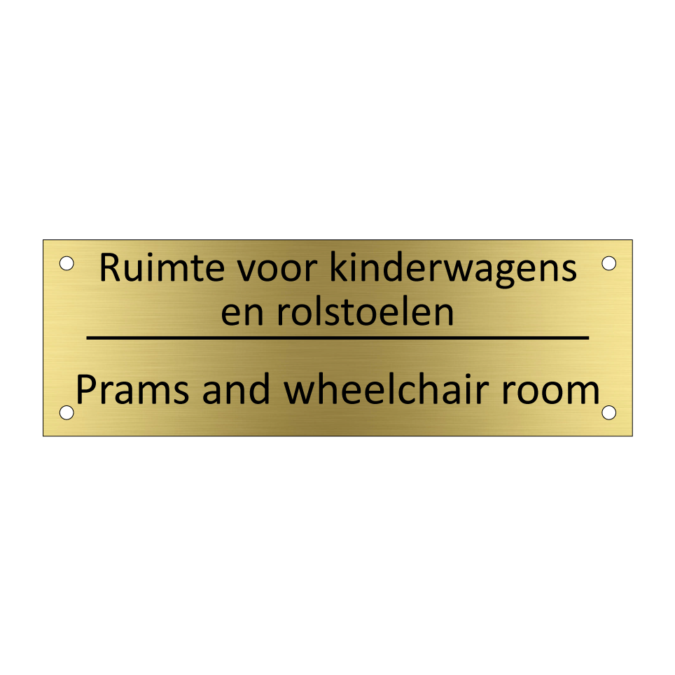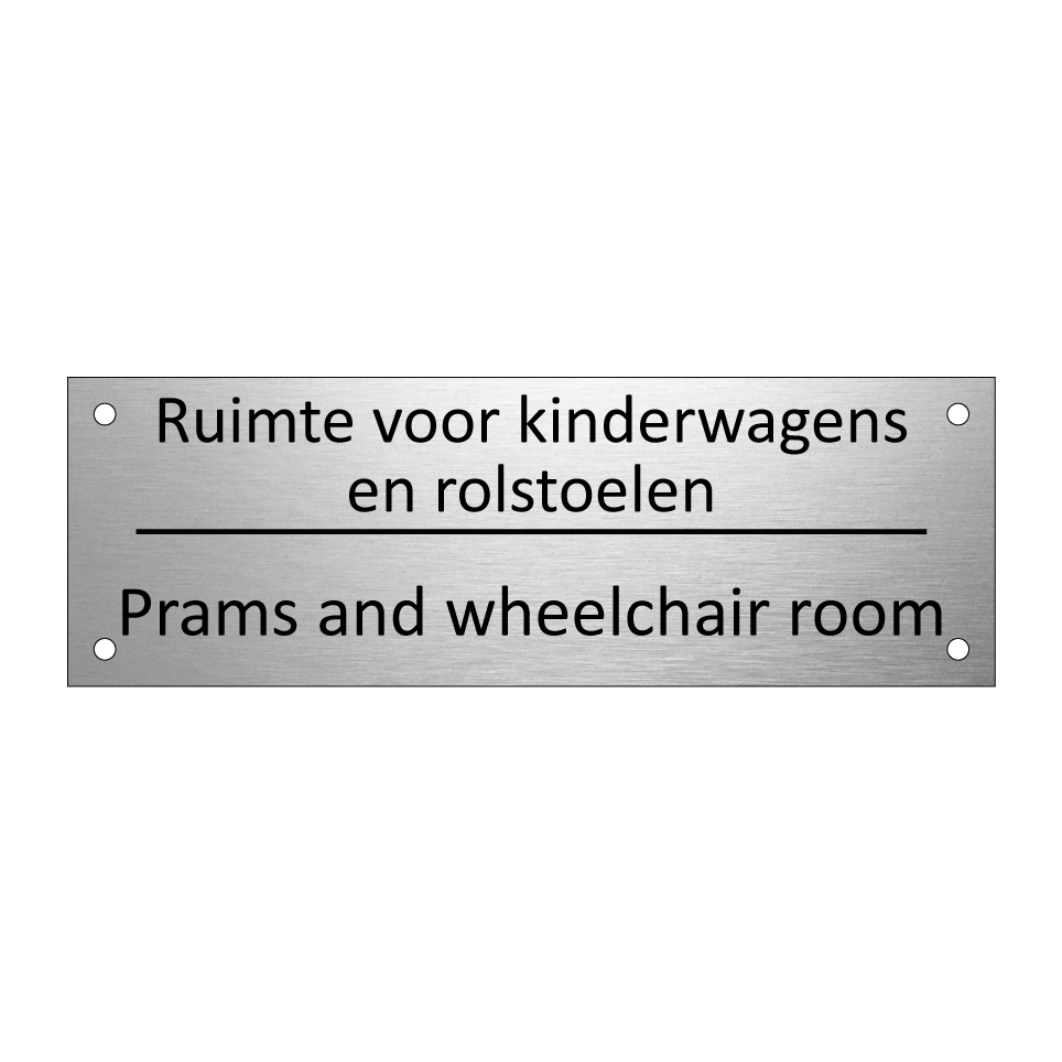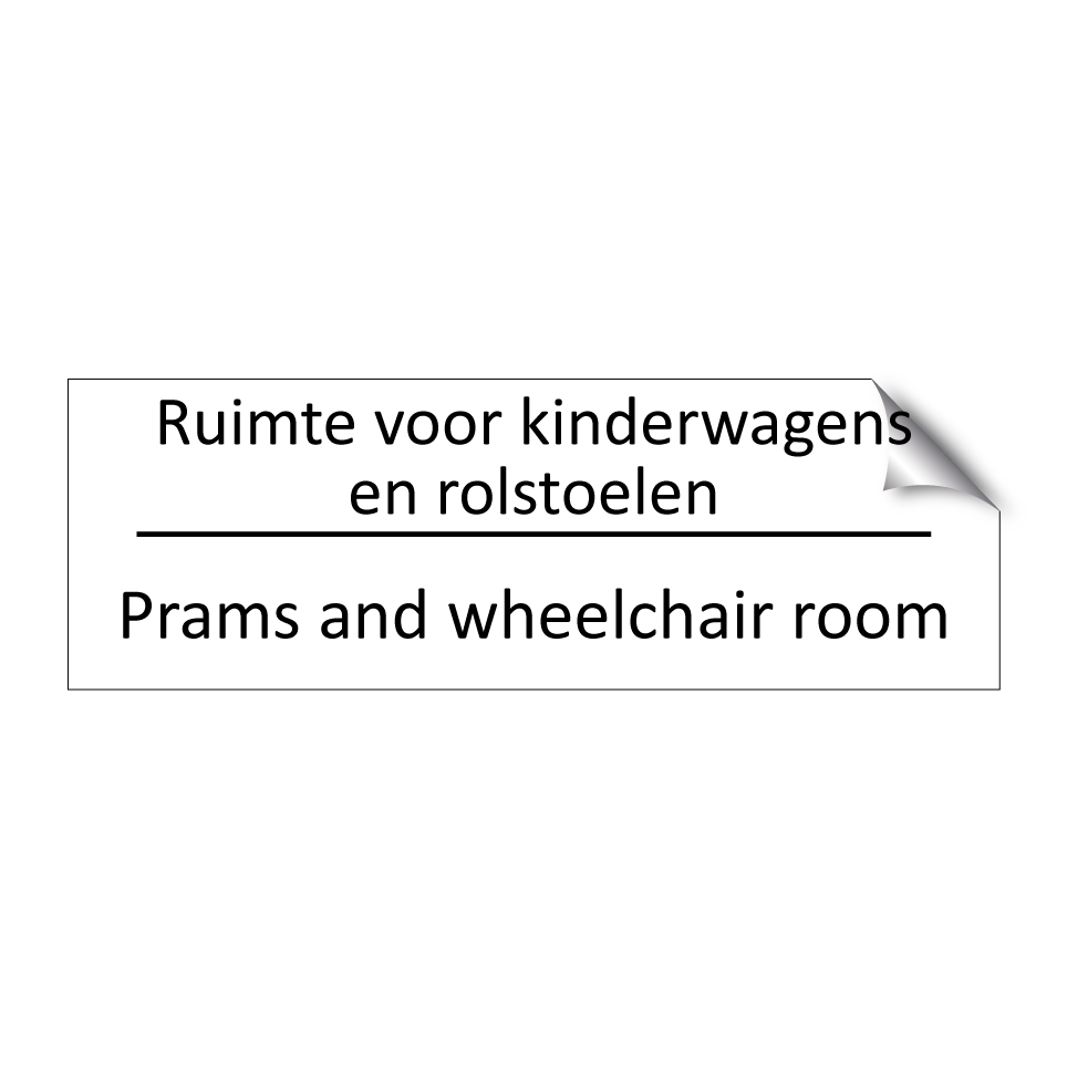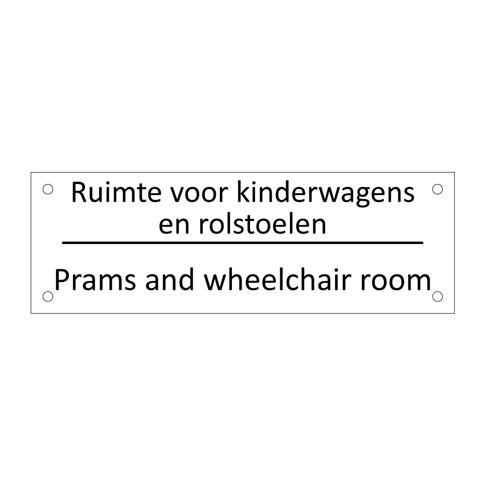 Informatiebord met tekst in het nederlands en engels. Dit bord luidt: Ruimte voor kinderwagens en rolstoelen evenals met de engelse vertaling Prams and wheelchair room.