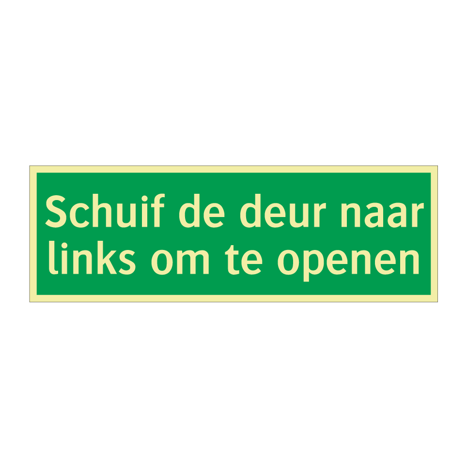 Deze noodbord is essentieel voor elke noodsituatie waar snelle evacuatie vereist is. Het bord geeft duidelijk aan dat de deur naar links moet worden geschoven om te openen, wat cruciaal kan zijn in panieksituaties. Ideaal voor gebruik in kantoren, scholen, ziekenhuizen en andere openbare gebouwen waar veiligheid een prioriteit is. Plaats dit noodbord bij nooduitgangen, trappenhuizen of andere strategische locaties om ervoor te zorgen dat iedereen snel en veilig kan ontsnappen. De groene achtergrond met witte tekst zorgt voor maximale zichtbaarheid, zelfs in slecht verlichte omstandigheden.