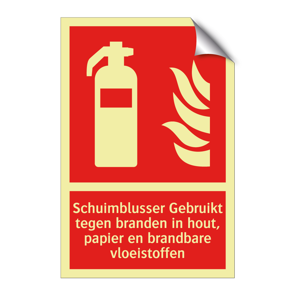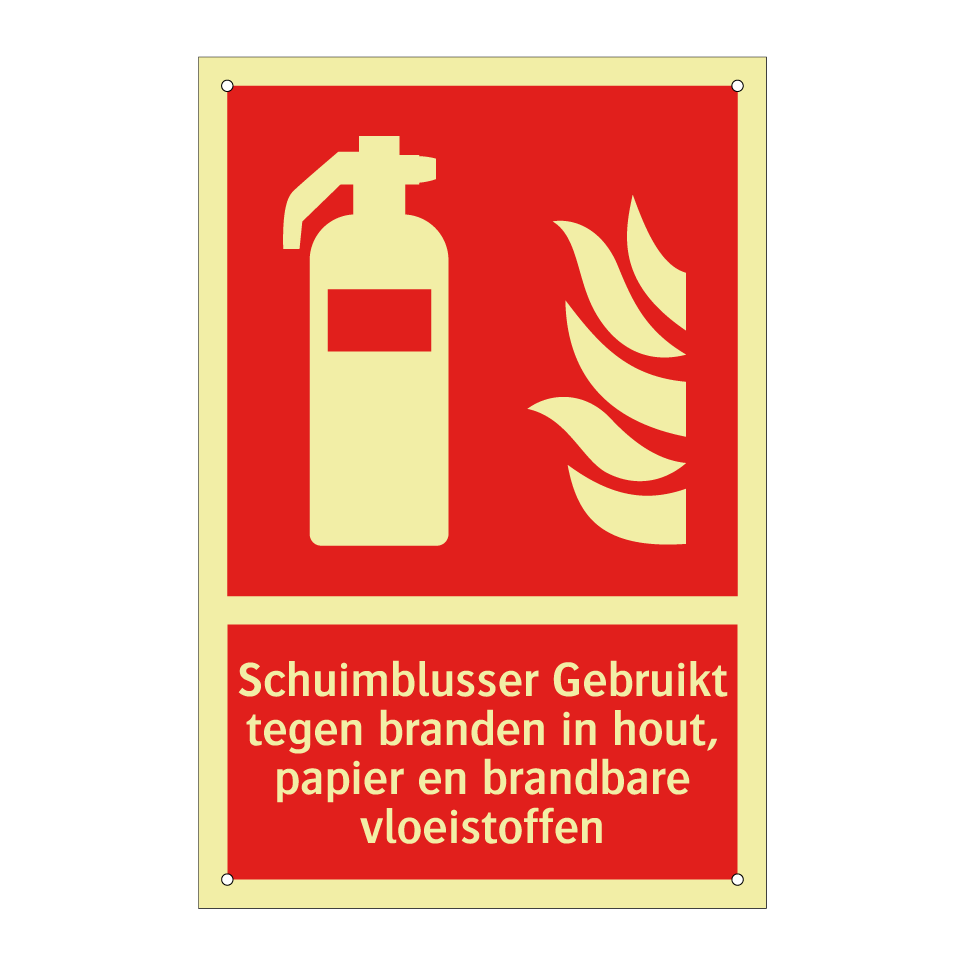 Brandbord met tekst Schuimblusser Gebruikt tegen branden in hout, papier en brandbare vloeistoffen