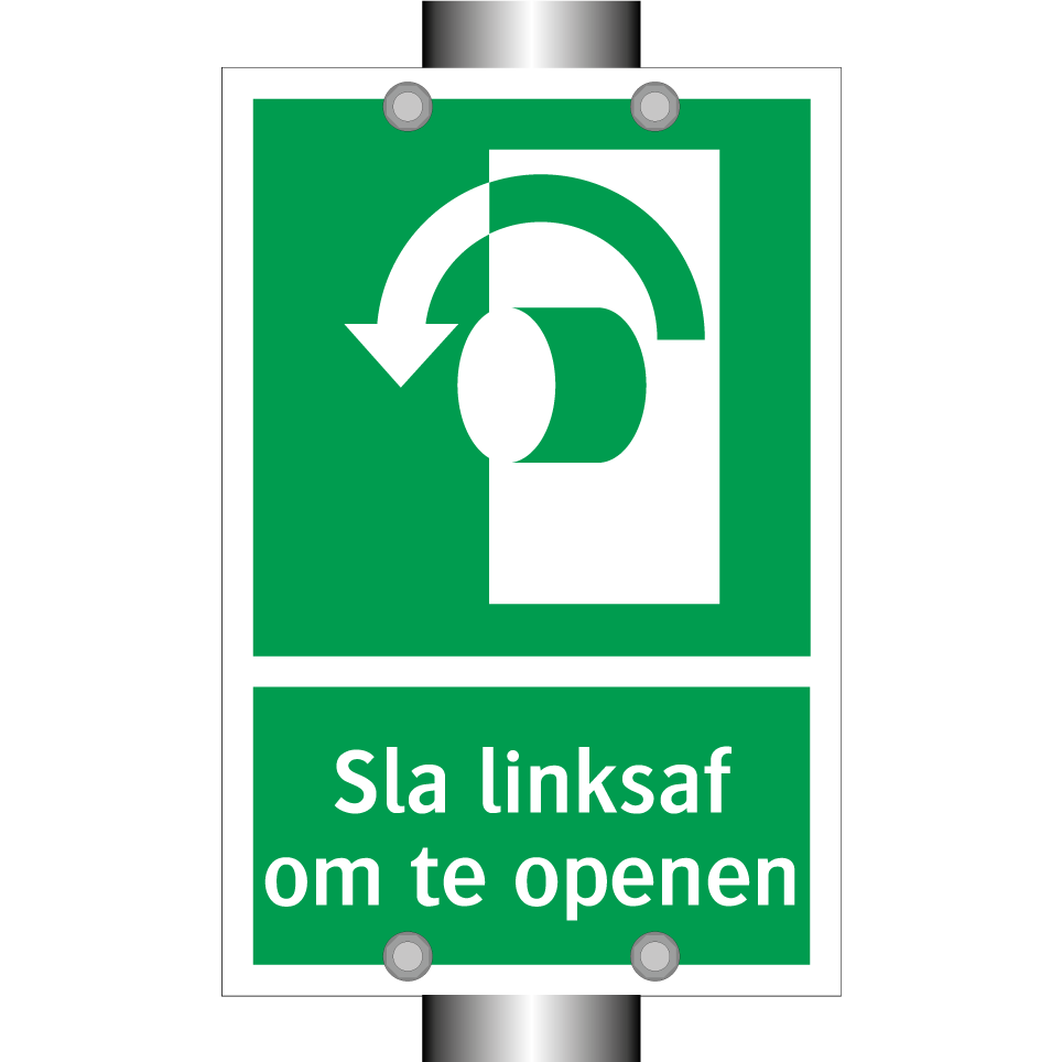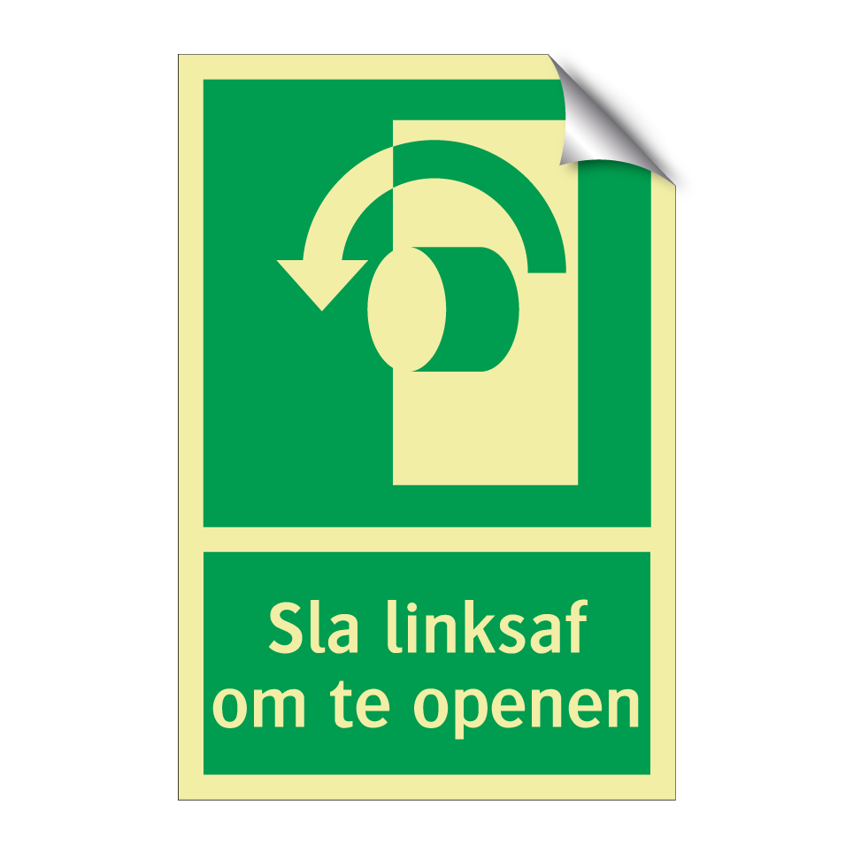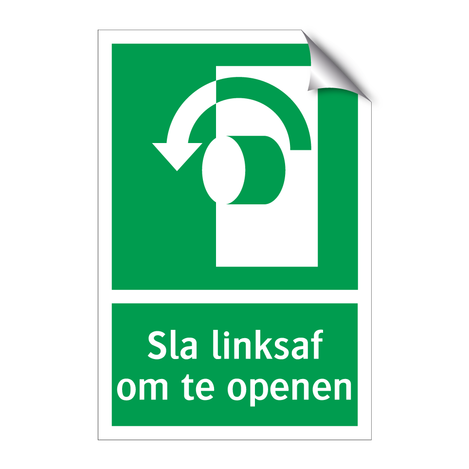 Deze noodbord is essentieel voor een veilige werkomgeving. Het geeft duidelijk aan dat men naar links moet draaien om een deur of nooduitgang te openen. Dit bordje is ideaal voor gebruik in kantoren, fabrieken, magazijnen en andere commerciële ruimtes waar snelle evacuatie noodzakelijk is. Plaats het op goed zichtbare plekken zoals gangen, trappenhuizen en bij nooduitgangen om ervoor te zorgen dat iedereen snel en veilig de juiste route kan vinden in geval van nood. De groene achtergrond met witte tekst en een duidelijke symbool zorgt voor maximale zichtbaarheid en herkenning, zelfs in stressvolle situaties.
