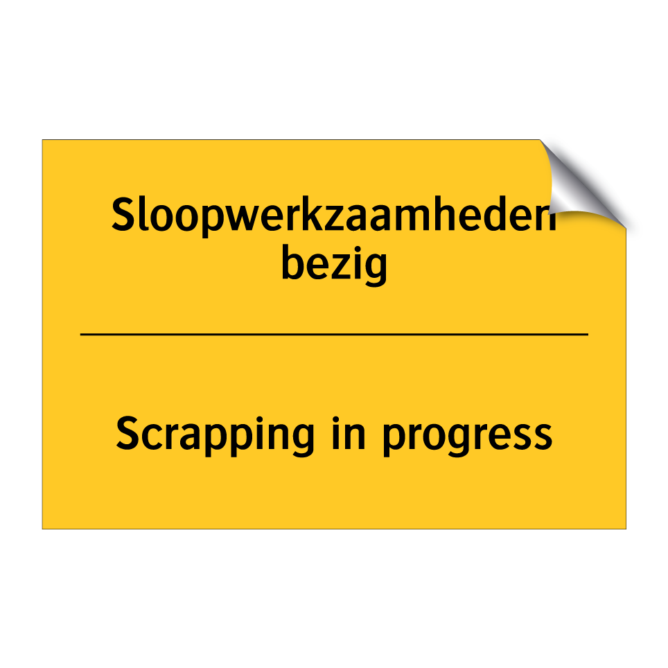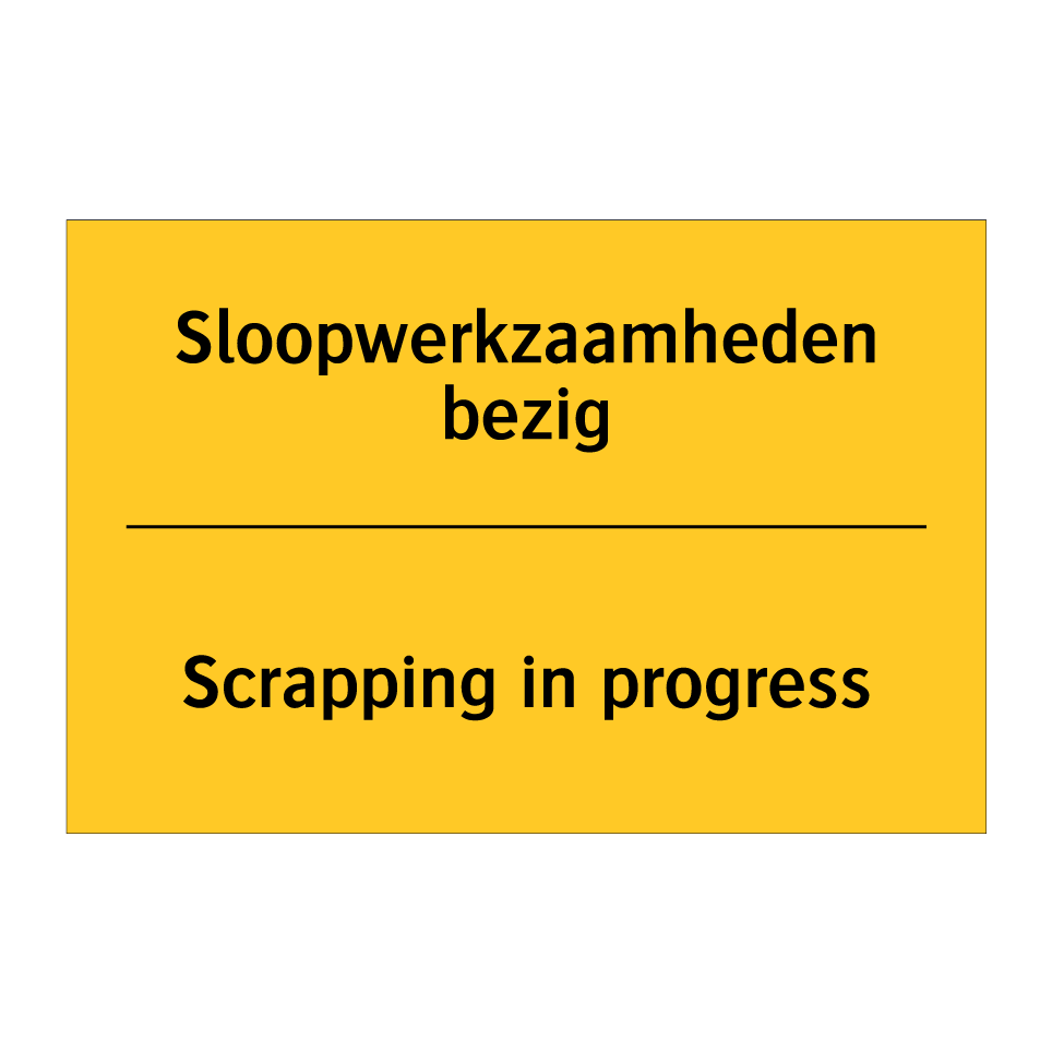 Waarschuwingsbord met de tekst Sloopwerkzaamheden bezig / Scrapping in progress