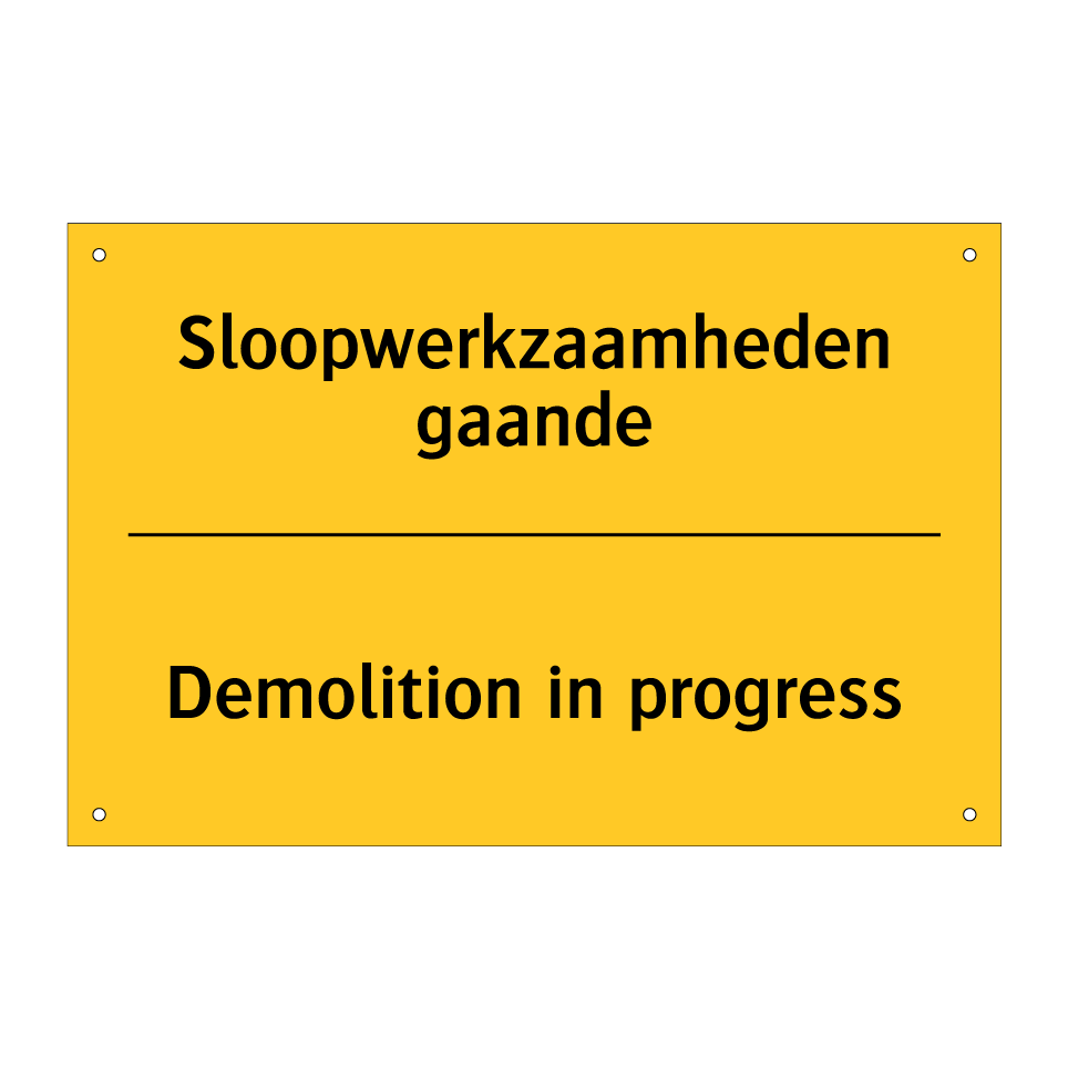 Waarschuwingsbord met de tekst Sloopwerkzaamheden gaande / Demolition in progress