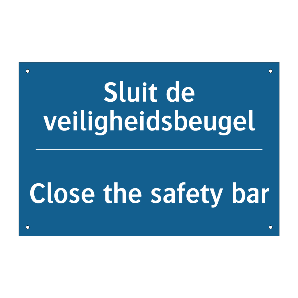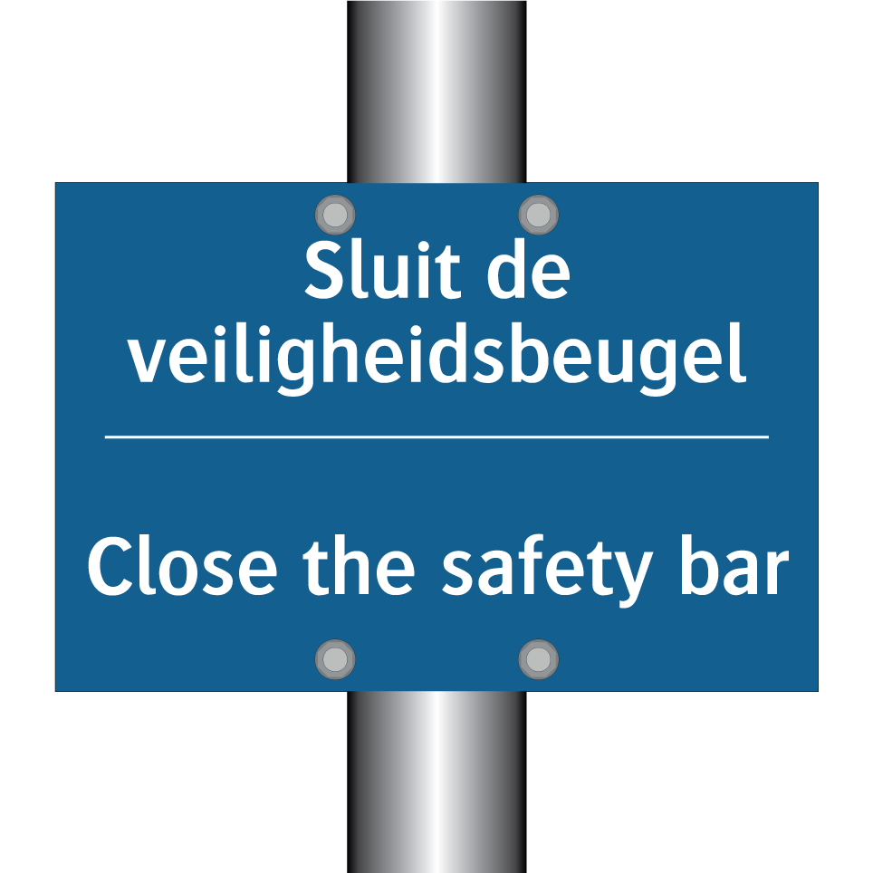 Verplichte bord met de tekst Sluit de veiligheidsbeugel - Close the safety bar